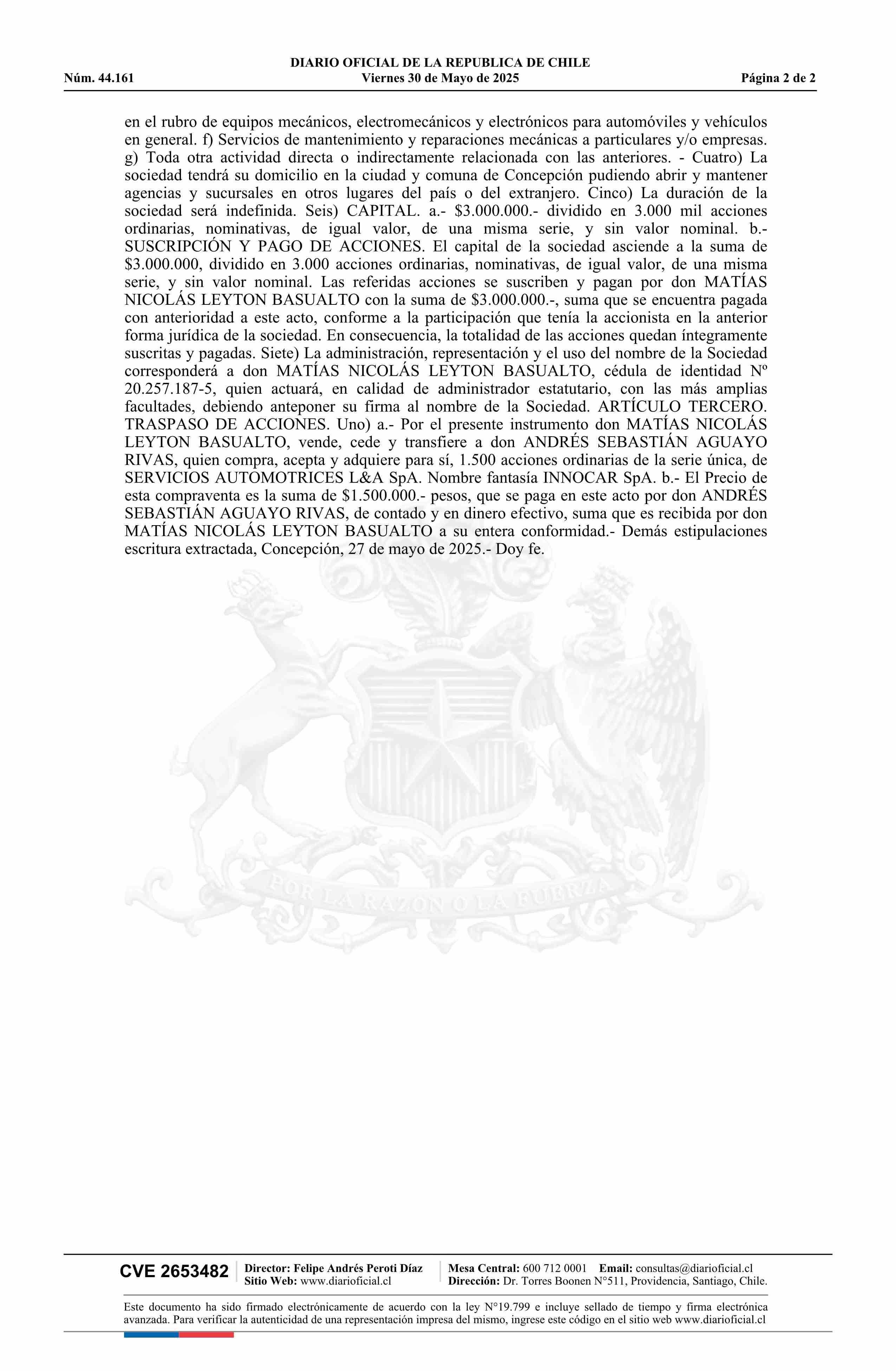 IMPORTADORA DE RESPUESTOS AUTOMOTRICES MATÍAS NICOLÁS LEYTON BASUALTO EMPRESA INDIVIDUAL DE RESPONSABILIDAD LIMITADA 77.942.116-3* 30-05-2025 Diario Oficial Edición Electrónica |