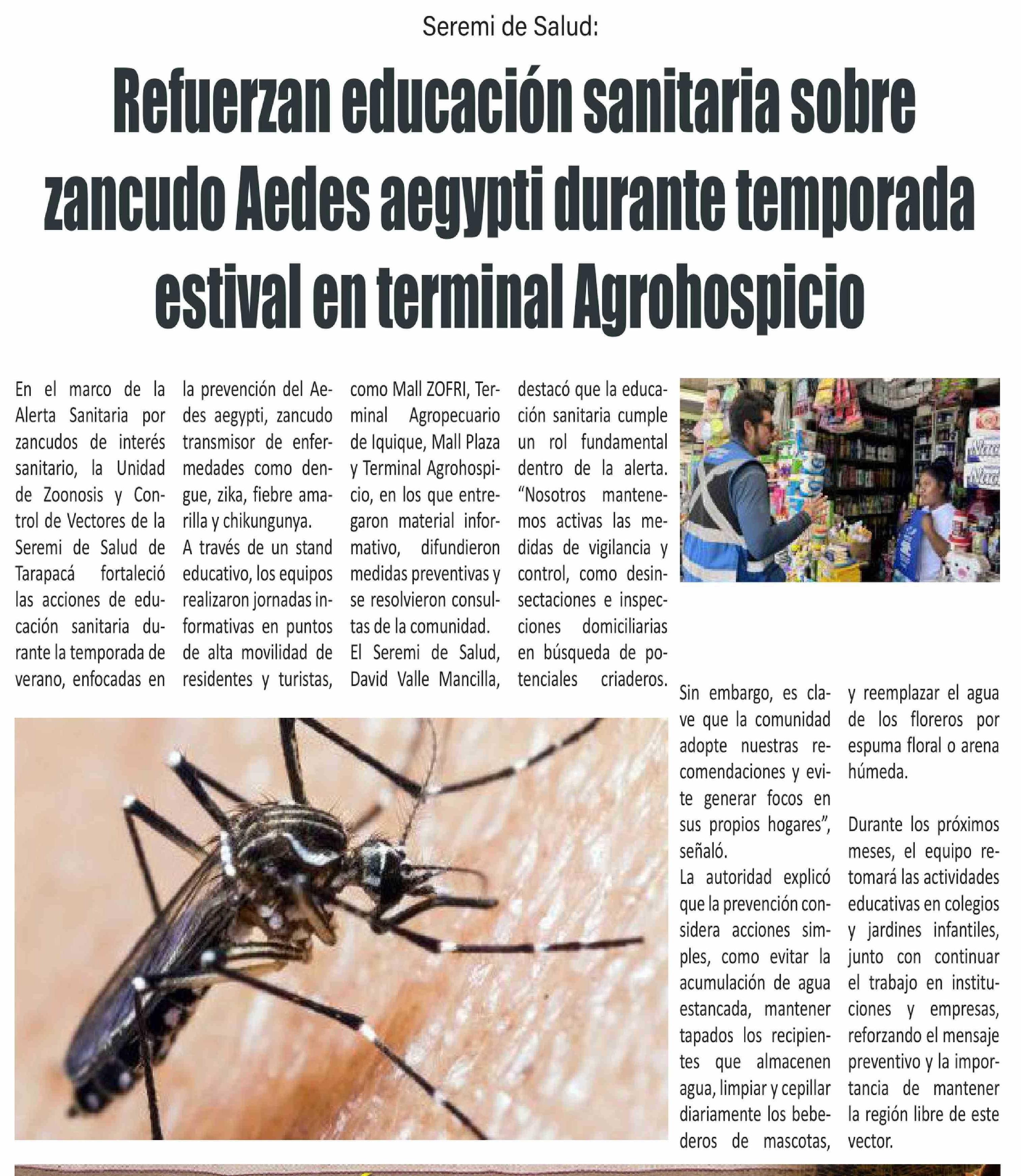 | Título: | Refuerzan educación sanitaria sobre zancudo Aedes aegypti durante temporada estival en terminal Agrohospicio |