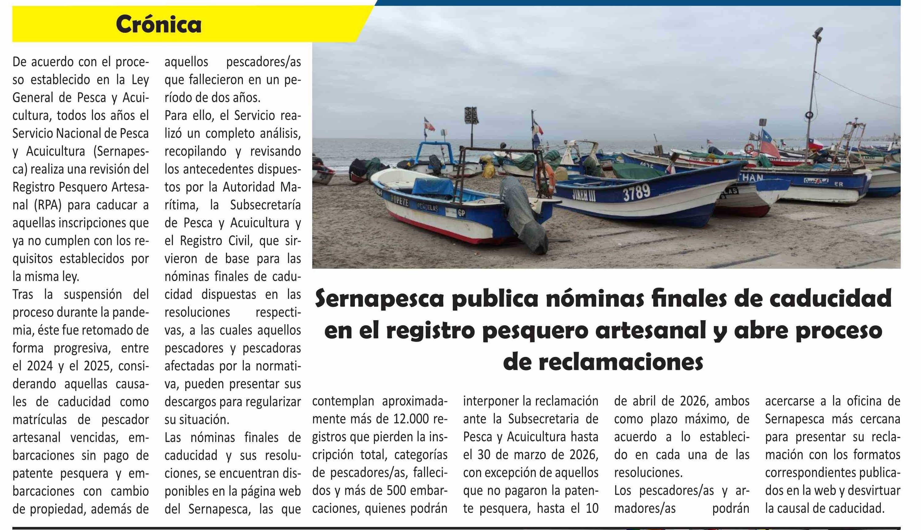 | Título: | Sernapesca publica nóminas finales de caducidad en el registro pesquero artesanal y abre proceso de reclamaciones |