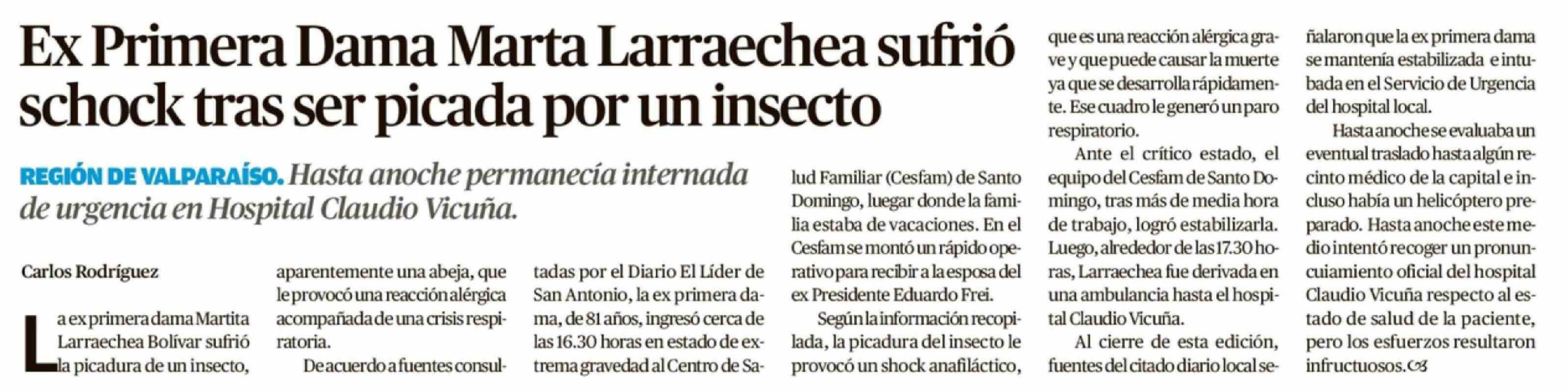 Título: Ex Primera Dama Marta Larraechea sufrió schock tras ser picada por un insecto