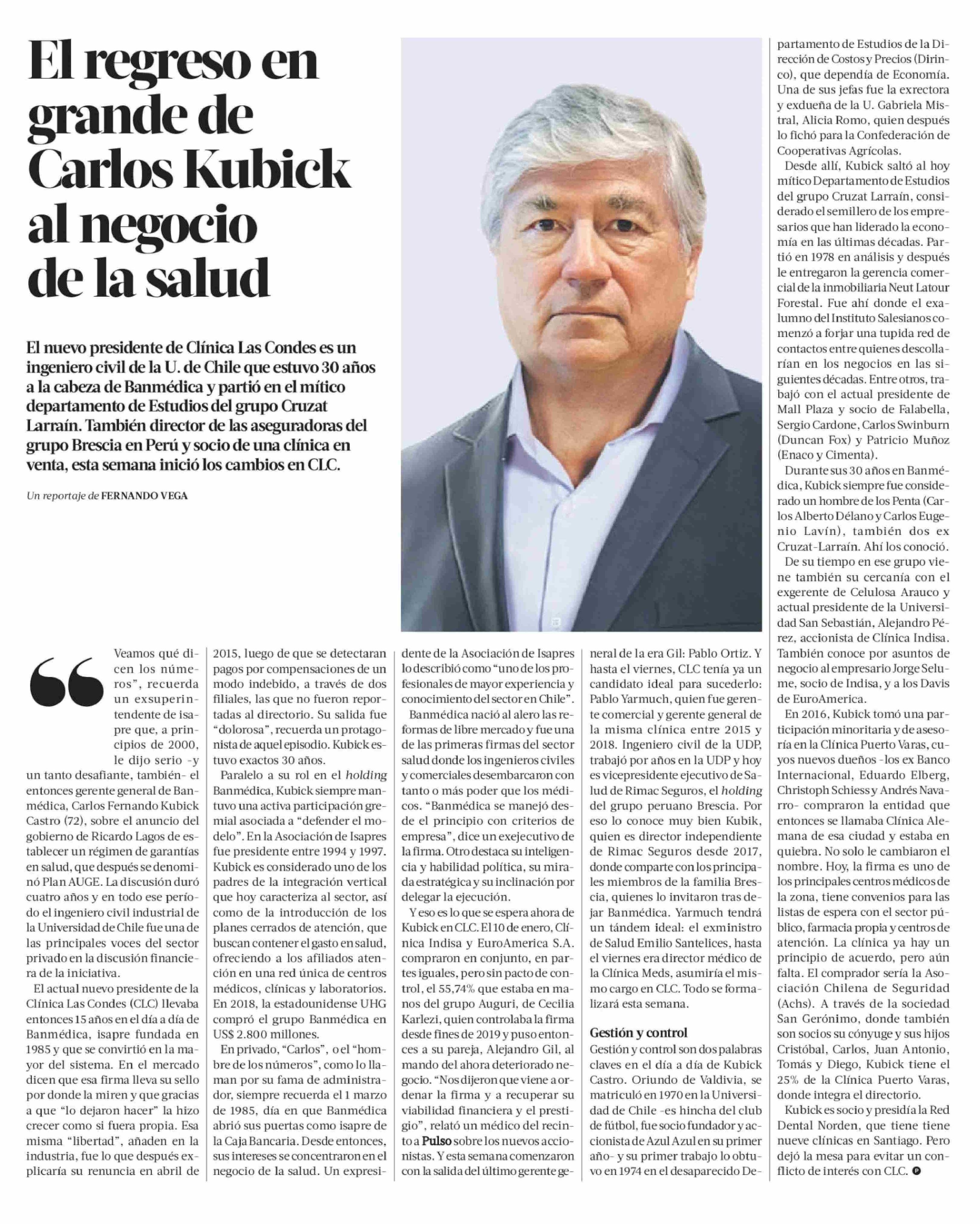 El regreso en grande de Carlos Kubick al negocio de la salud 26-01-2025 La Tercera |