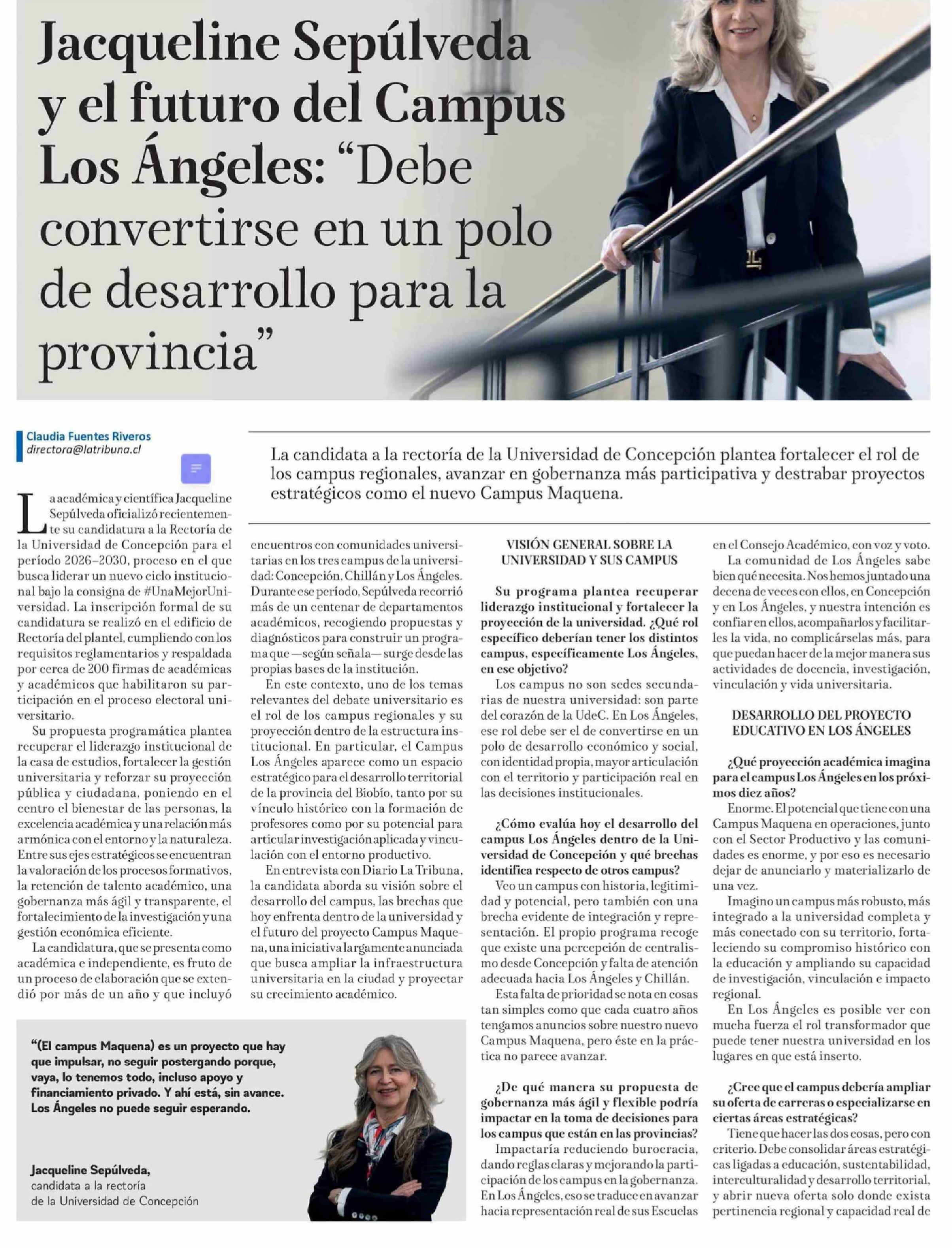 Jacqueline Sepúlveda y el futuro del Campus Los Ángeles: "Debe convertirse en un polo de desarrollo para la provincia" 14-03-2026 La Tribuna |