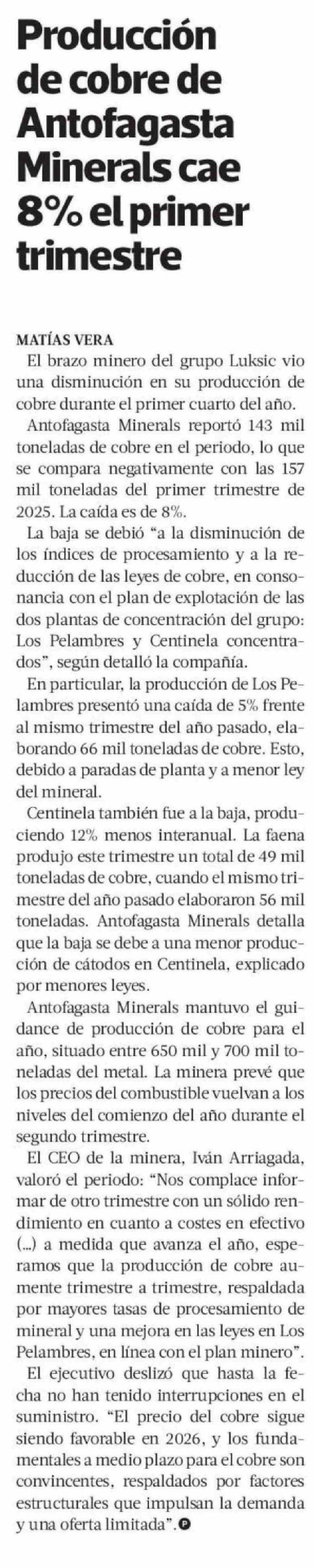 Producción de cobre de Antofagasta Minerals cae 8% el primer trimestre 16-04-2026 La Tercera |