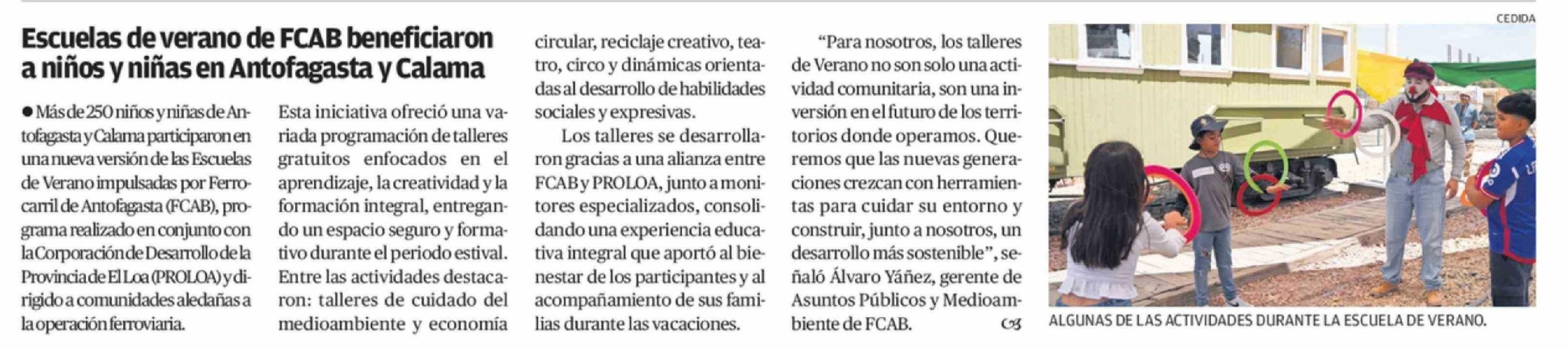 Escuelas de verano de FCAB beneficiaron a niños y niñas en Antofagasta y Calama 21-02-2026 El Mercurio de Antofagasta |