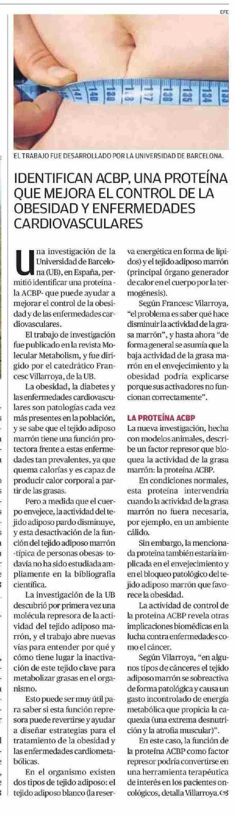 Título: IDENTIFICAN ACBP, UNA PROTEÍNA CARDIOVASCULARES OBESIDAD Y ENFERMEDADES QUE MEJORA EL CONTROL DE LA