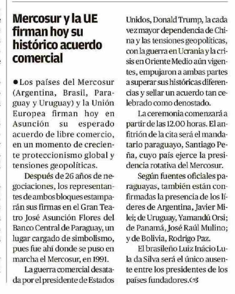 Título: · Los países del Mercosur (Argentina, Brasil, Paraguay y Uruguay) y la Unión Europea firman hoy en Asunción su esperado acuerdo de libre comercio, en un momento de creciente proteccionismo global y tensiones geopolíticas. Después de 26 años de negociaciones, los representantes de ambos bloques estam