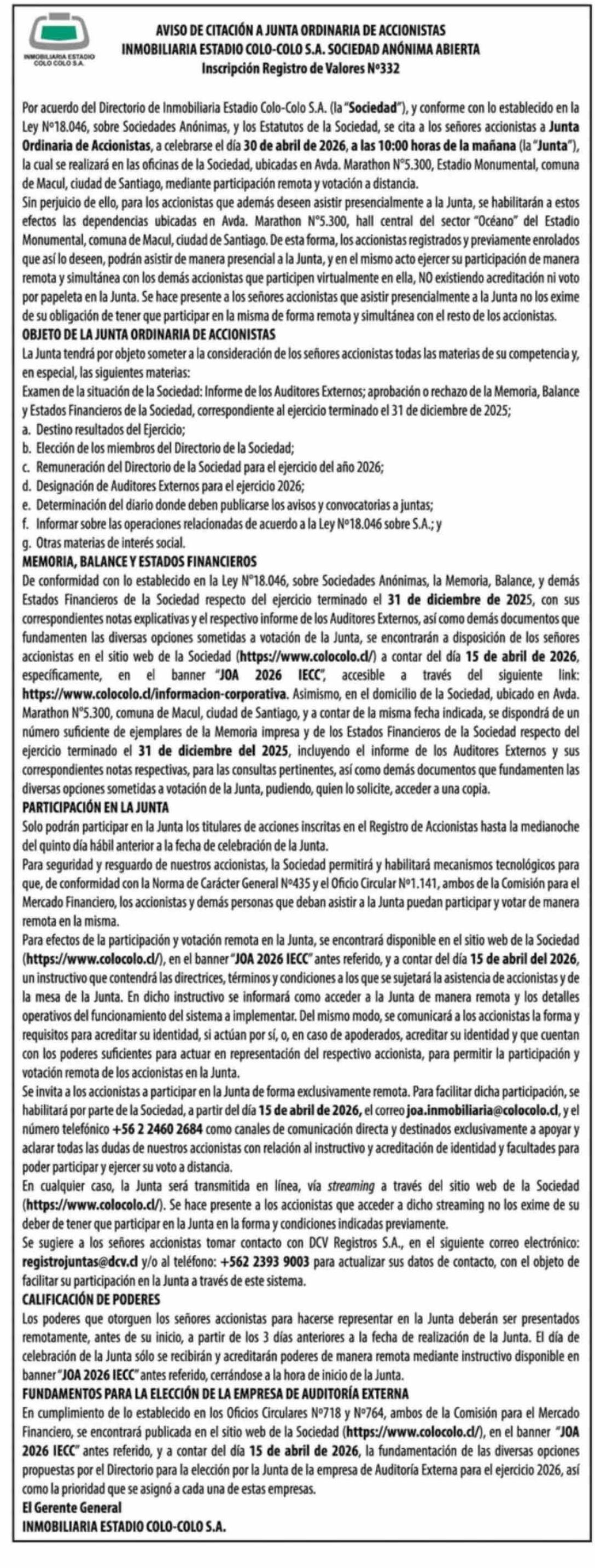 Extractos: AVISO DE CITACIÓN A JUNTA ORDINARIA DE ACCIONISTAS INMOBILIARIA ESTADIO COLO-COLO S.A. SOCIEDAD ANÓNIMA ABIERTA Inscripción Registro de Valores Nº332 15-04-2026 Las Últimas Noticias |