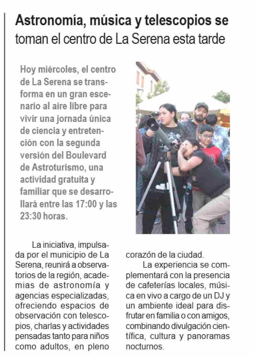 Título: Astronomia, música y telescopios se toman el centro de La Serena esta tarde