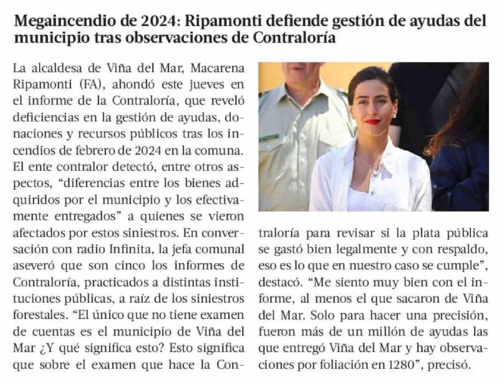 Megaincendio de 2024: Ripamonti defiende gestión de ayudas del municipio tras observaciones de Contraloría 13-02-2026 La Tercera |