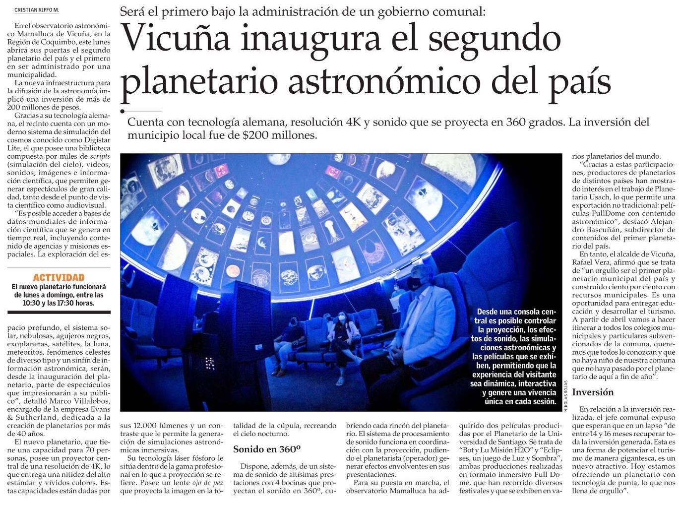 Vicuña inaugura el segundo planetario astronómico del país 20-02-2022 El Mercurio |