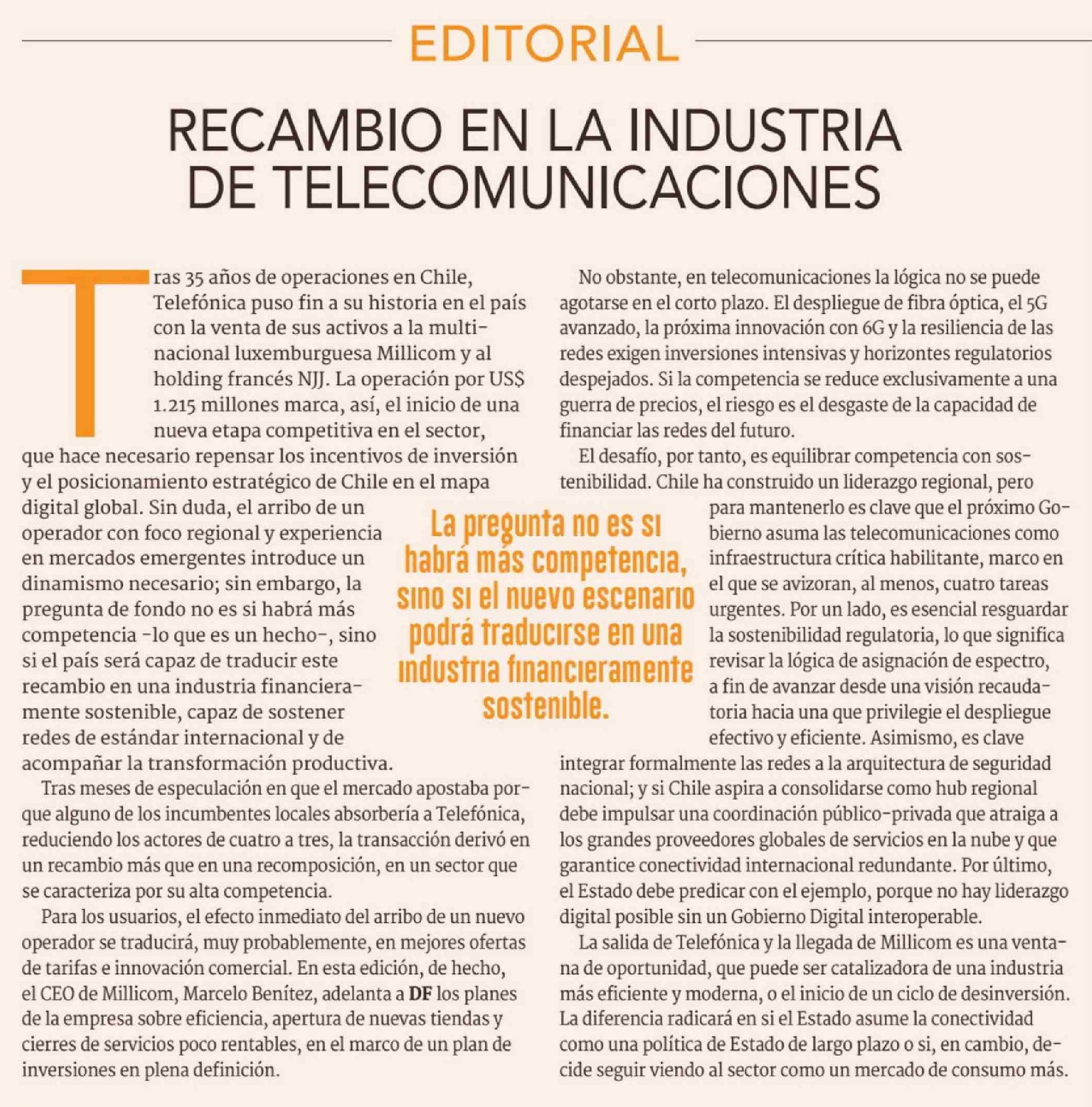 Editorial: RECAMBIO EN LA INDUSTRIA DE TELECOMUNICACIONES 19-02-2026 Diario Financiero |