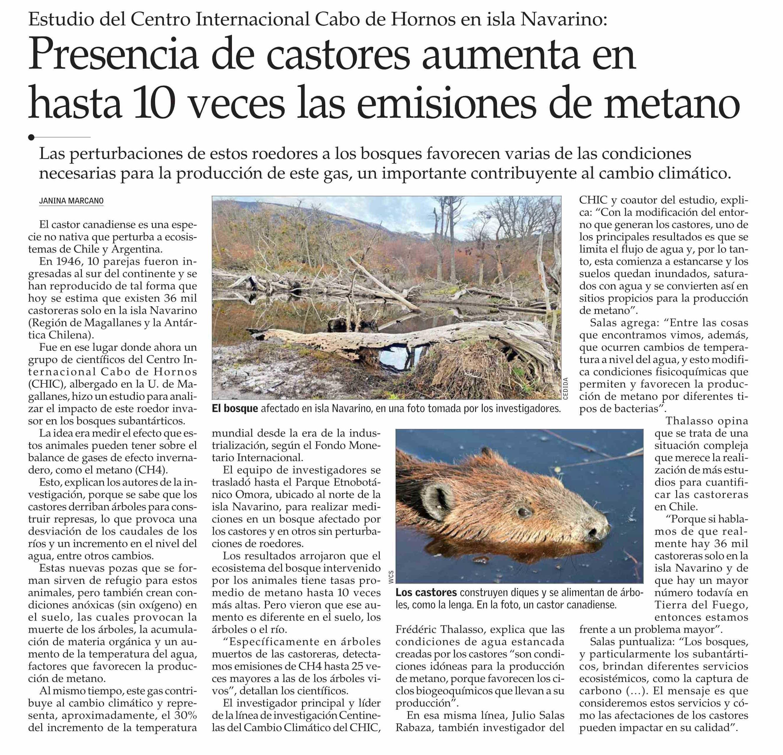 Presencia de castores aumenta en hasta 10 veces las emisiones de metano 06-07-2023 El Mercurio |