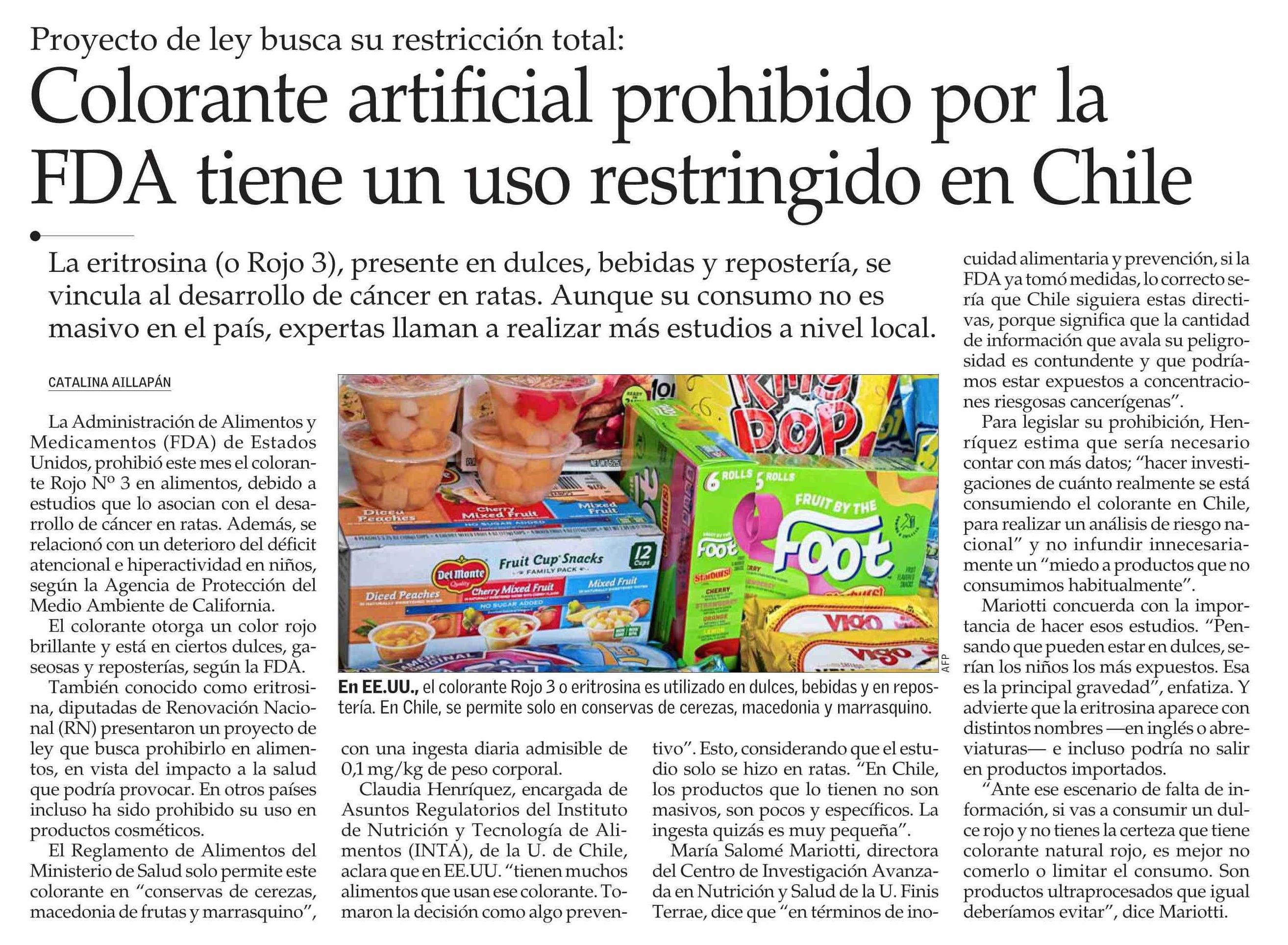 Colorante artificial prohibido por la FDA tiene un uso restringido en Chile 30-01-2025 El Mercurio |