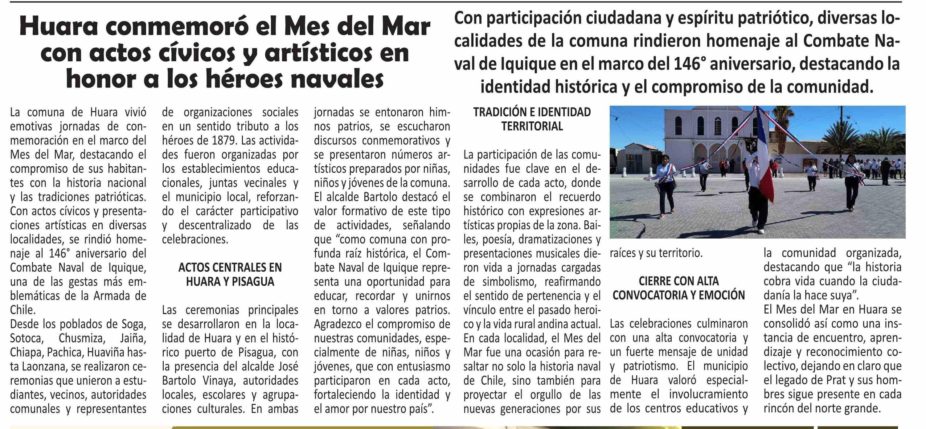 | Título: | Huara conmemoró el Mes del Mar con actos cívicos y artísticos en honor a los héroes navales |