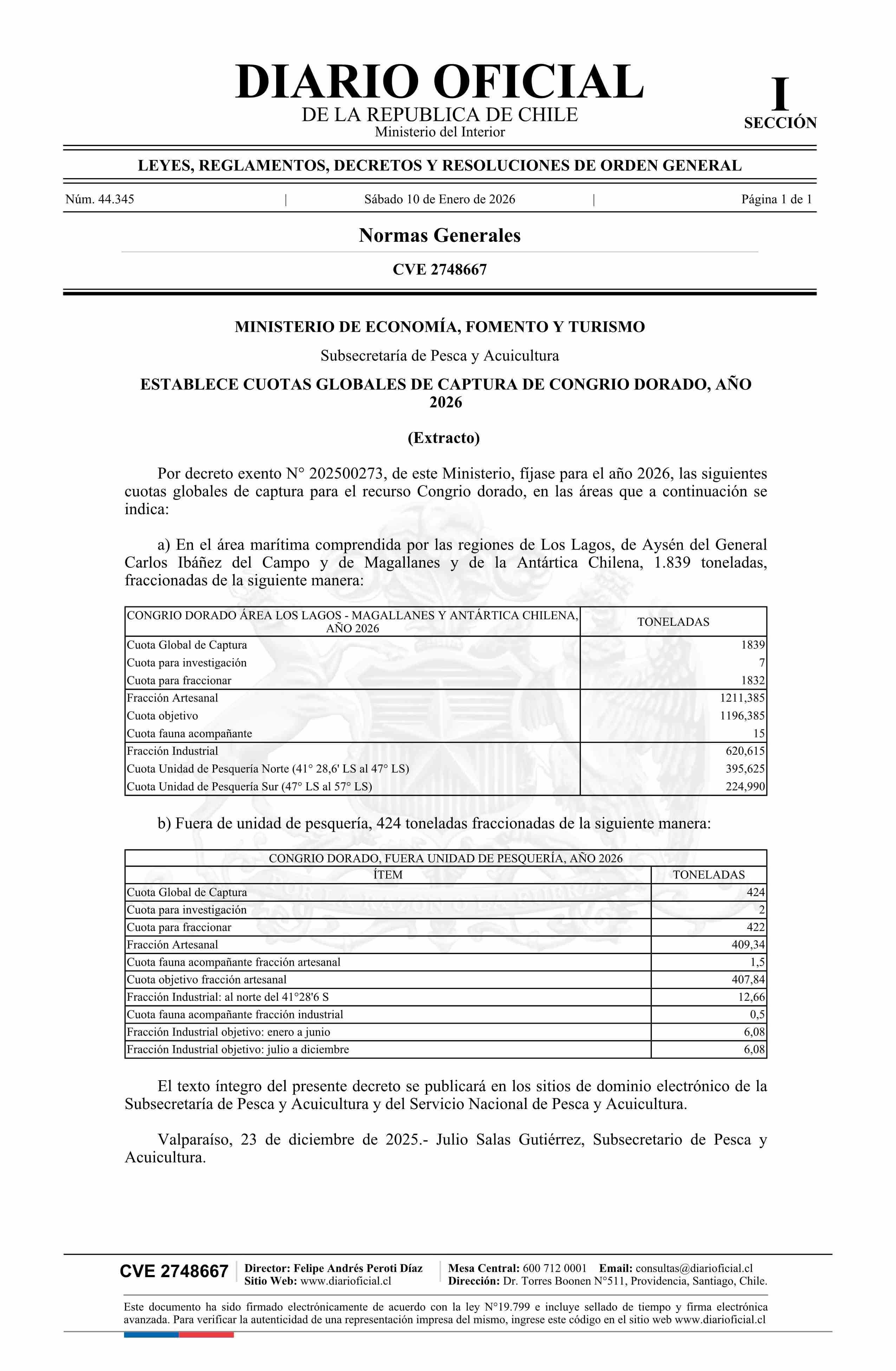 Título: Extracto de decreto exento número 202500273, de 2025.- Establece cuotas globales de captura de Congrio dorado, año 2026