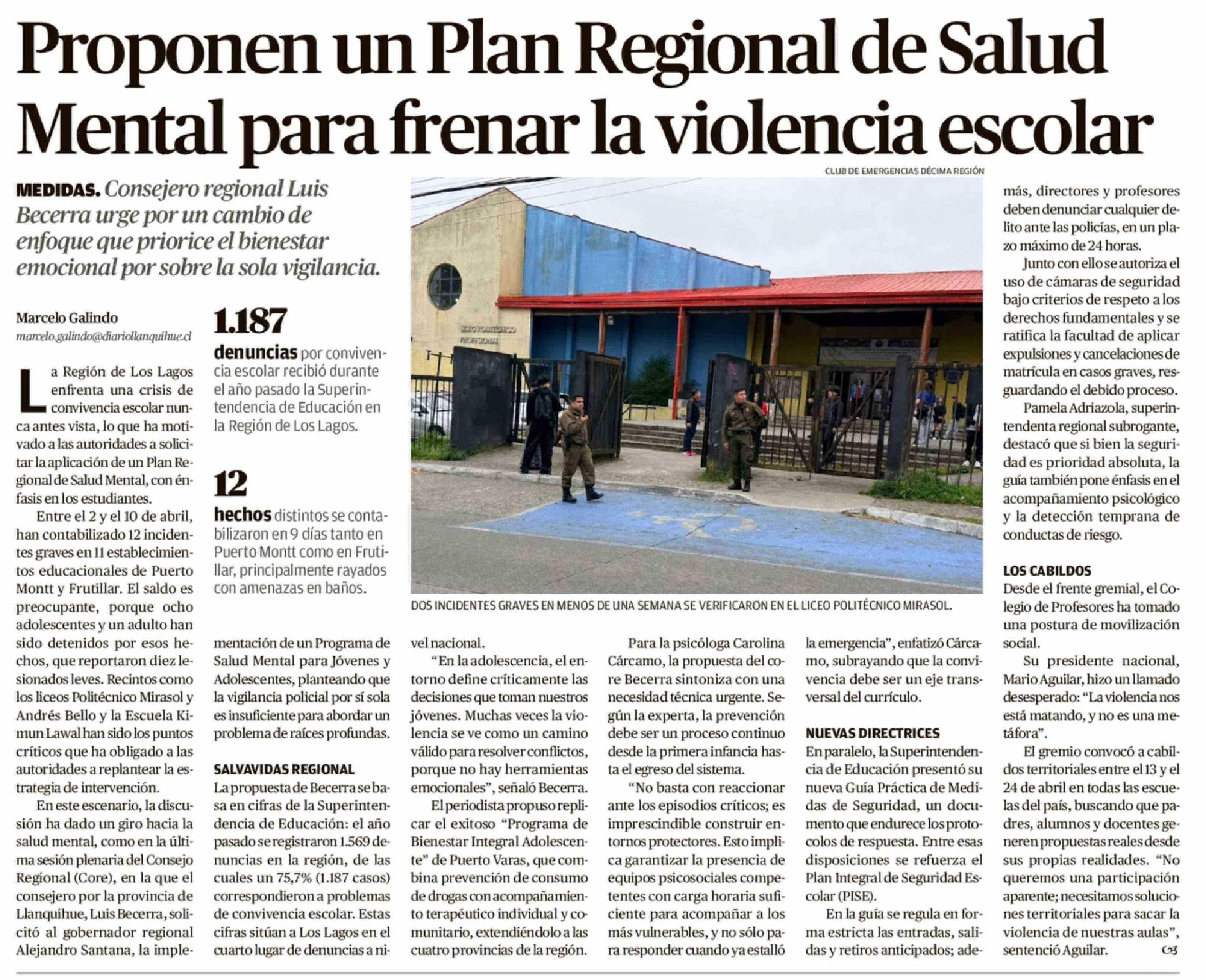 Proponen un Plan Regional de Salud Mental para frenar la violencia escolar 12-04-2026 El Llanquihue |