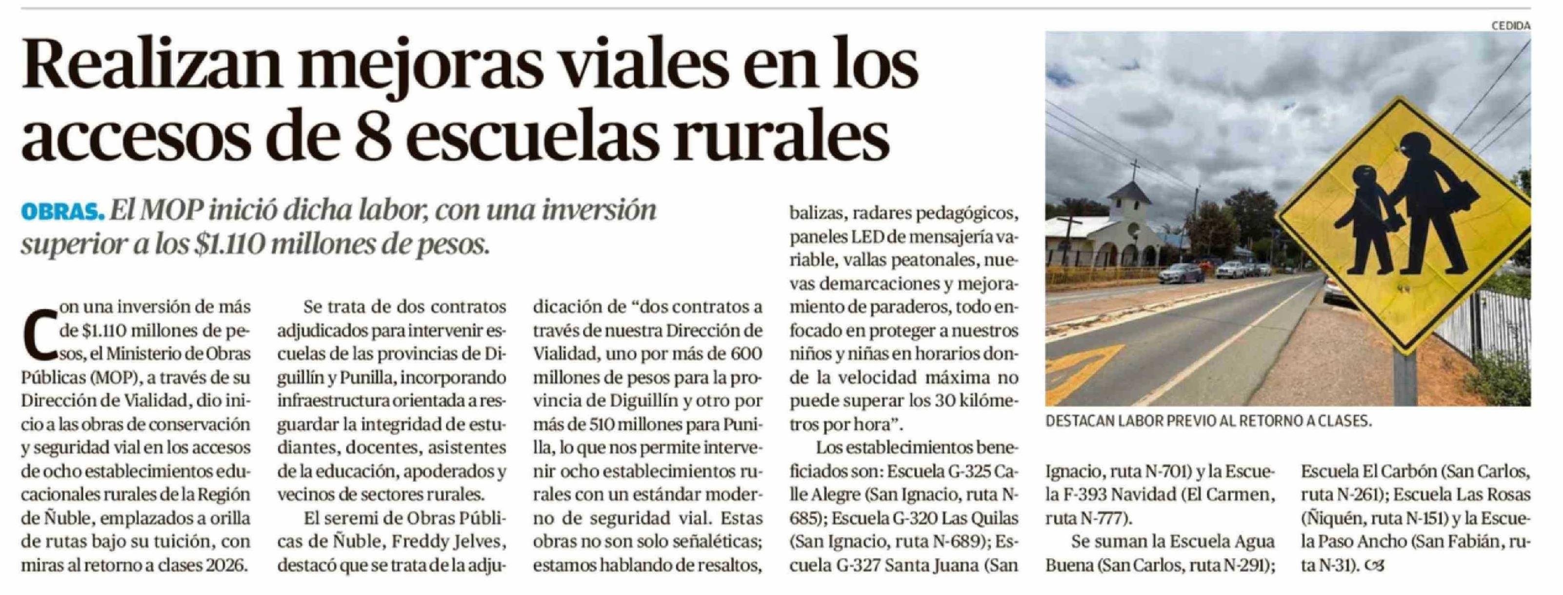 Realizan mejoras viales en los accesos de 8 escuelas rurales 04-03-2026 Crónica de Chillán |