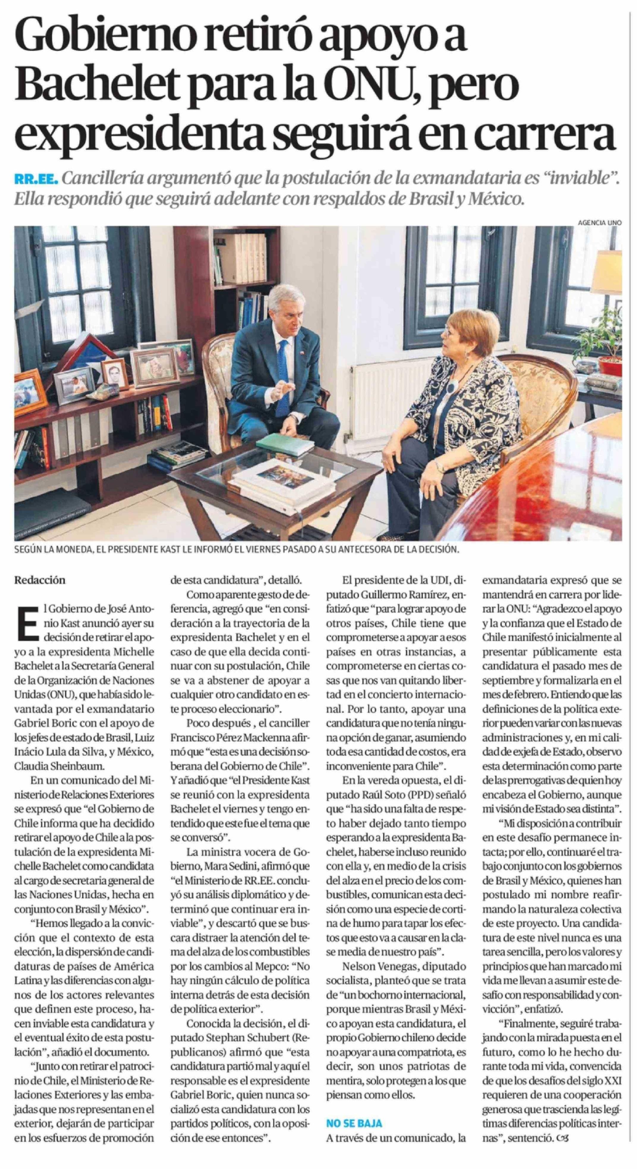 Título: Gobierno retiró apoyo a Bachelet para la ONU, pero expresidenta seguirá en carrera