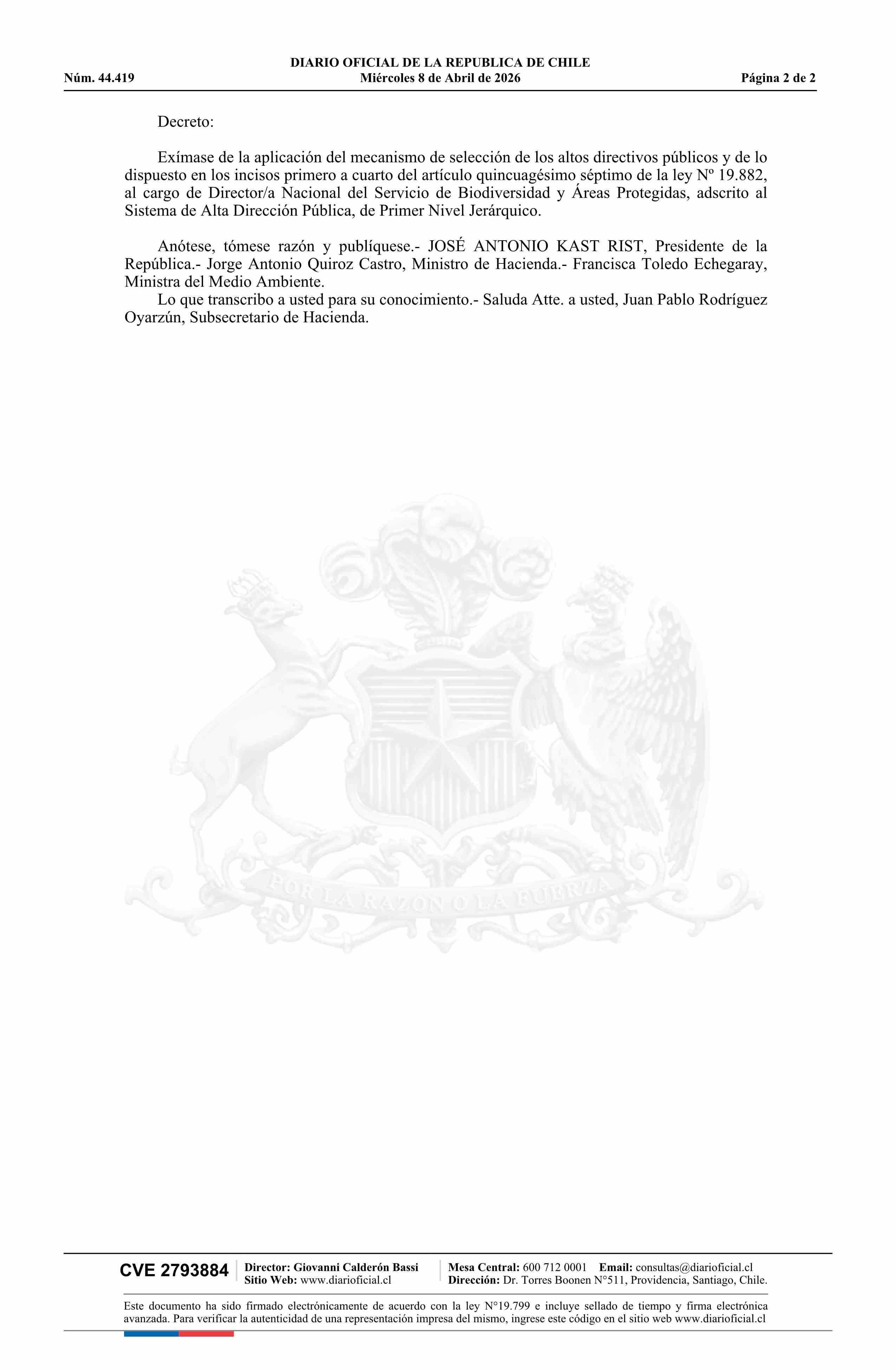 Decreto número 294, de 2026.- Decide eximir de la aplicación del mecanismo de selección de los altos directivos públicos y de lo dispuesto en los incisos primero a cuarto del artículo quincuagésimo séptimo de la ley Nº 19.882, al cargo de Director/a Nacional del Servicio de Biodiversidad y Áreas Pro