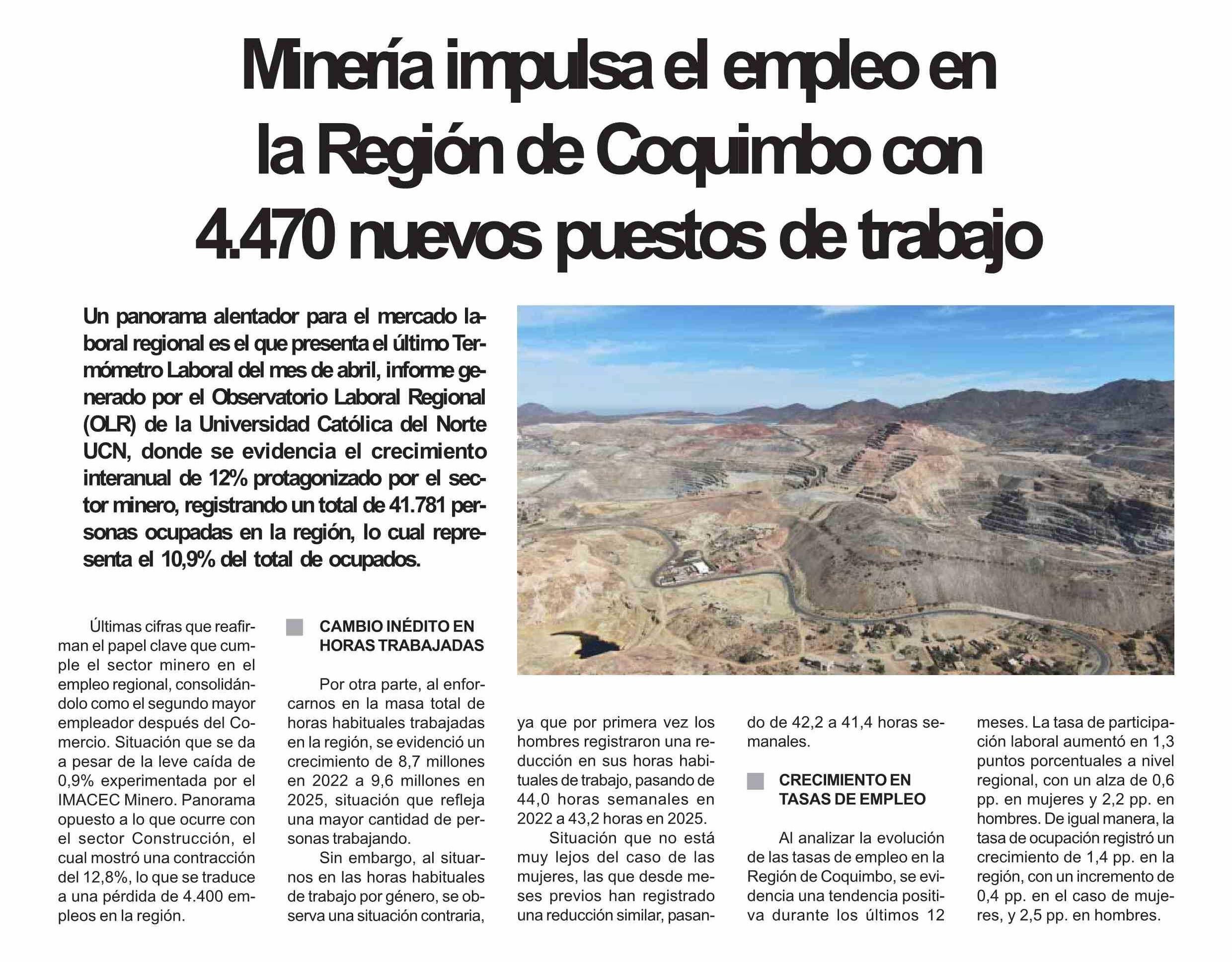 Minería impulsa el empleo en la Región de Coquimbo con 4.470 nuevos puestos de trabajo 16-04-2025 Diario la Región |