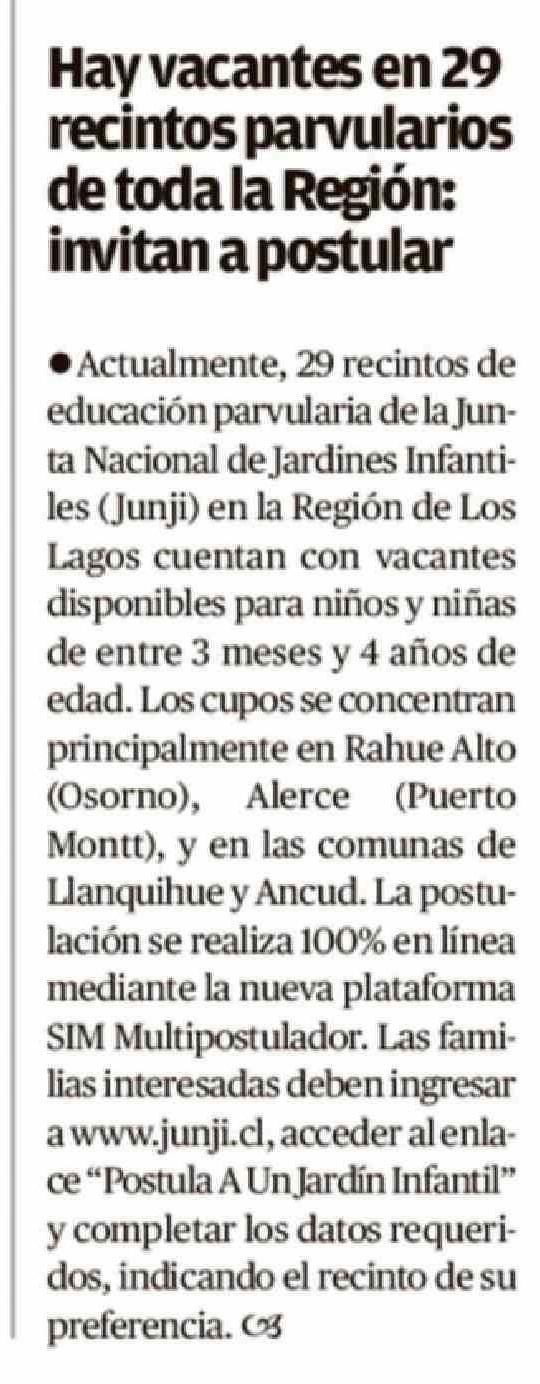 Hay vacantes en 29 recintos parvularios de toda la Región: invitan a postular 07-04-2026 El Austral de Osorno |