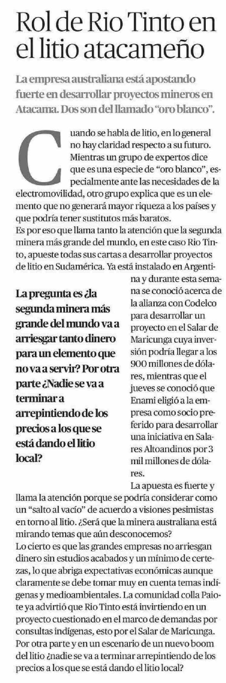 Rol de Rio Tinto en el litio atacameño 24-05-2025 El Diario de Atacama |