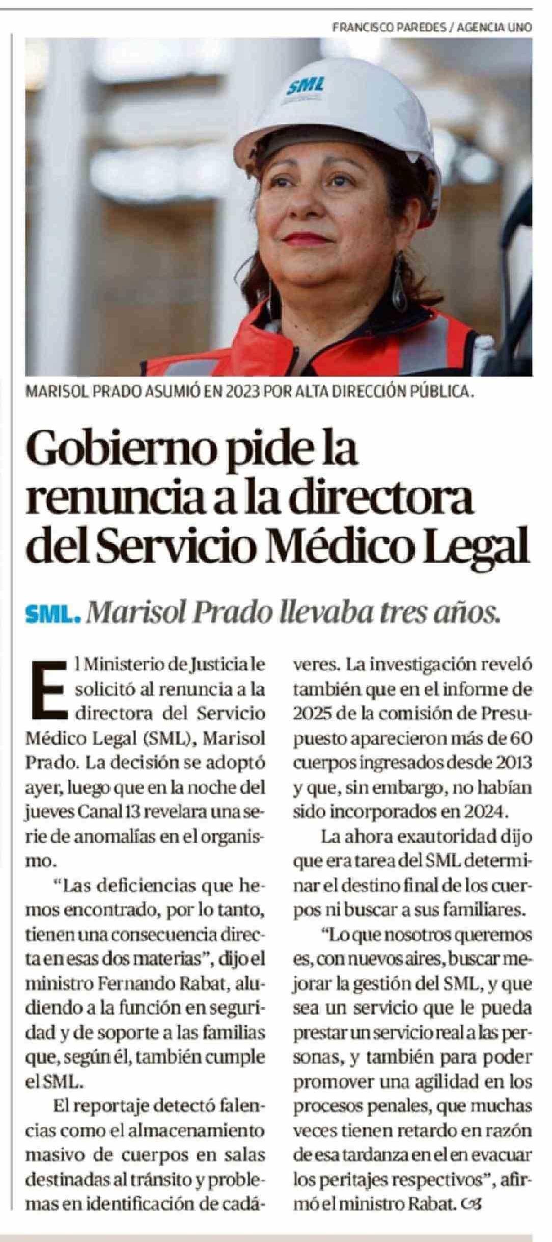| Título: | Gobierno pide la renuncia a la directora del Servicio Médico Legal |