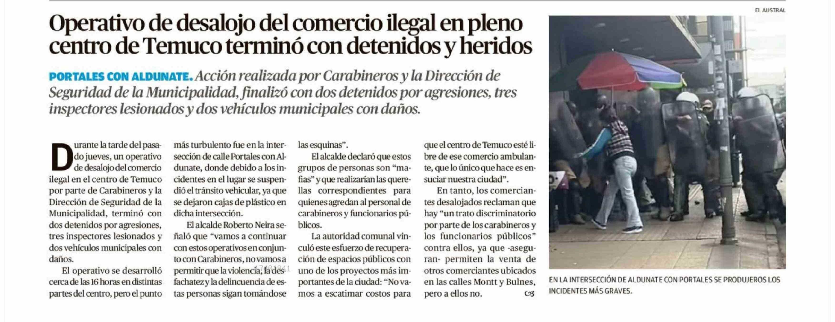 Operativo de desalojo del comercio ilegal en pleno centro de Temuco terminó con detenidos y heridos 25-04-2026 El Austral de la Araucanía |