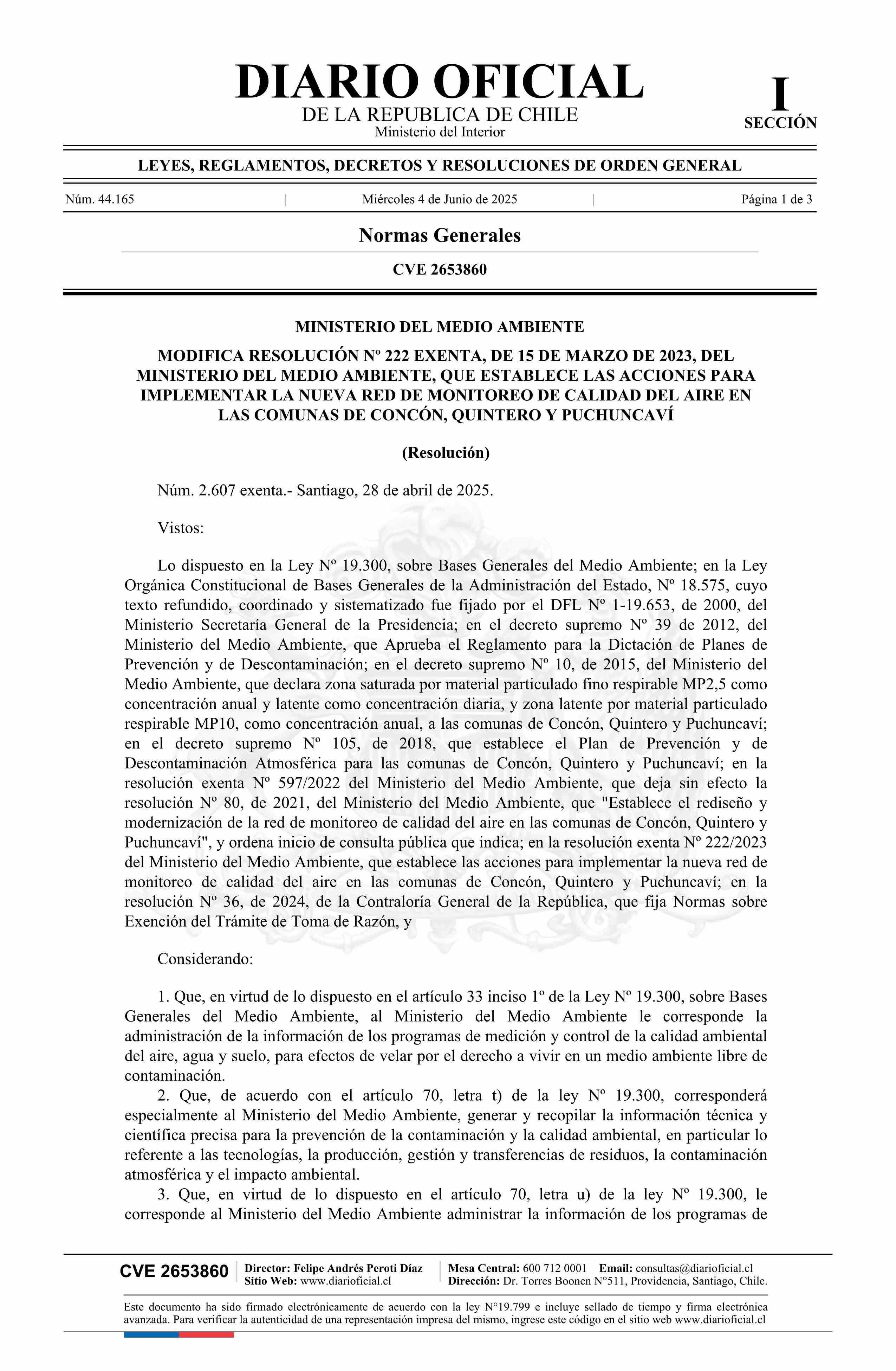 | Título: | Resolución exenta número 2.607, de 2025.- Modifica resolución Nº 222 exenta, de 2023, que establece las acciones para implementar la nueva red de monitoreo de calidad del aire en las comunas de Concón, Quintero y Puchuncaví |