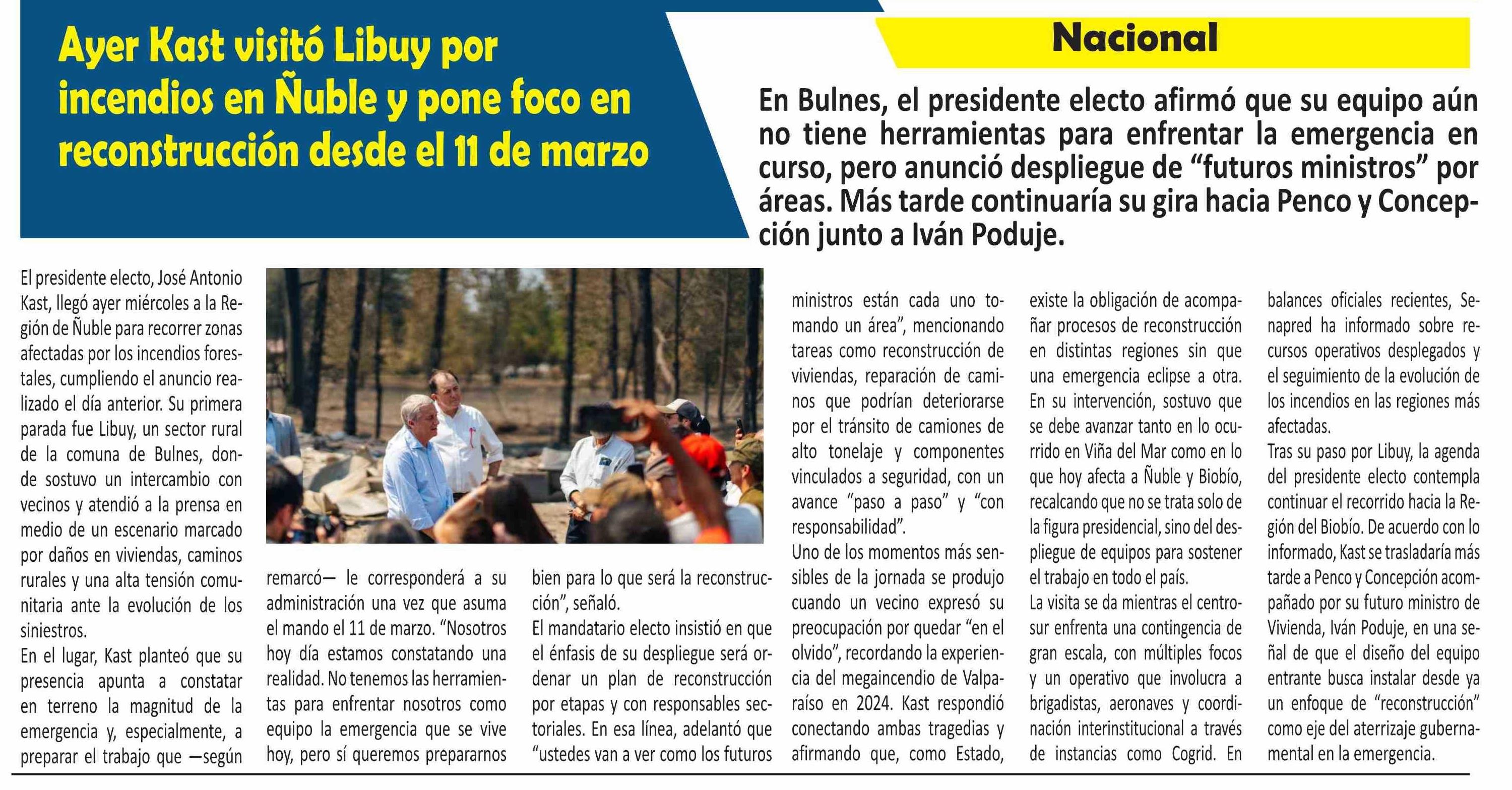 Ayer Kast visitó Libuy por incendios en Nuble y pone foco en reconstrucción desde el 11 de marzo 22-01-2026 El Longino |