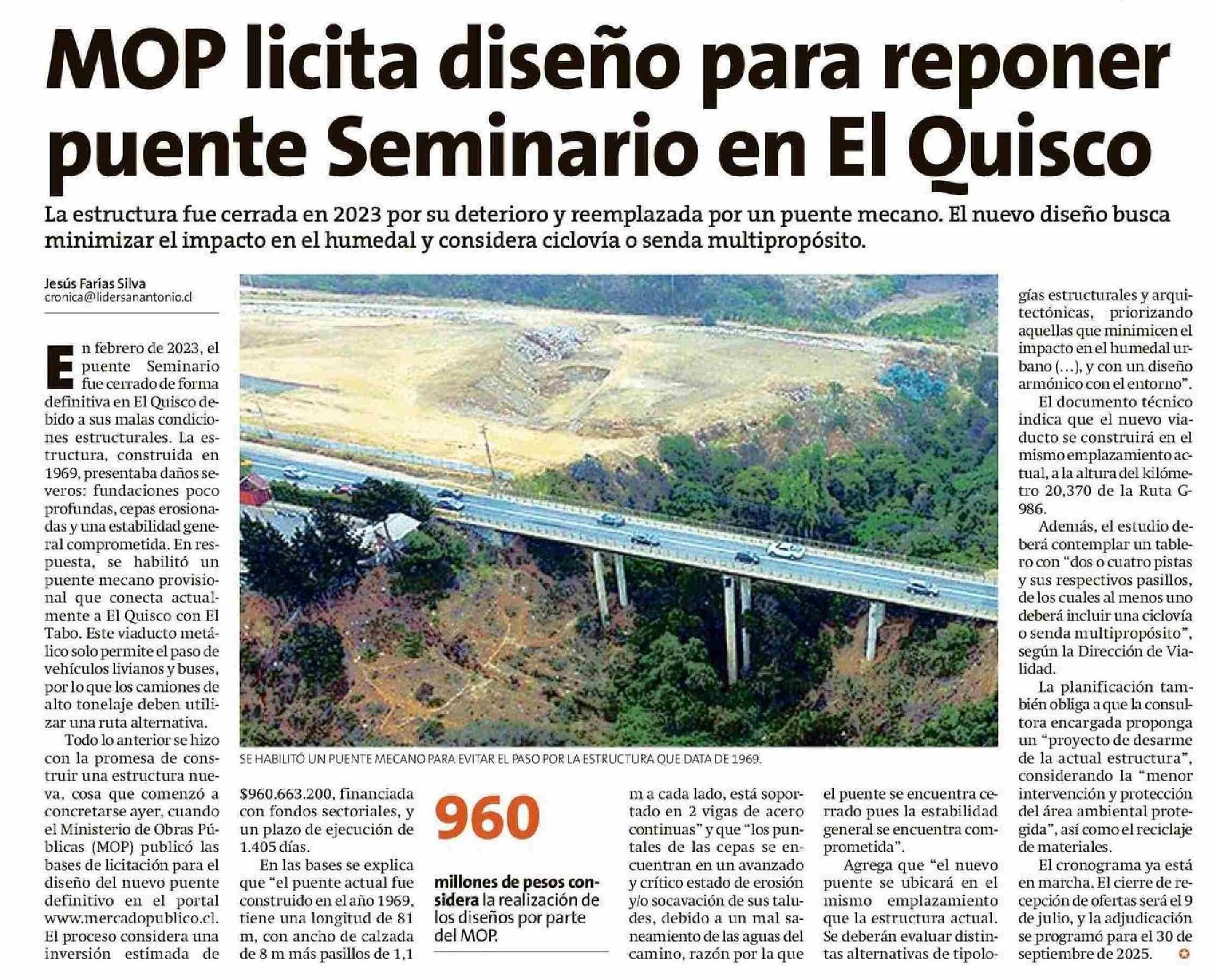 MOP licita diseño para reponer puente Seminario en El Quisco 03-06-2025 El Líder |