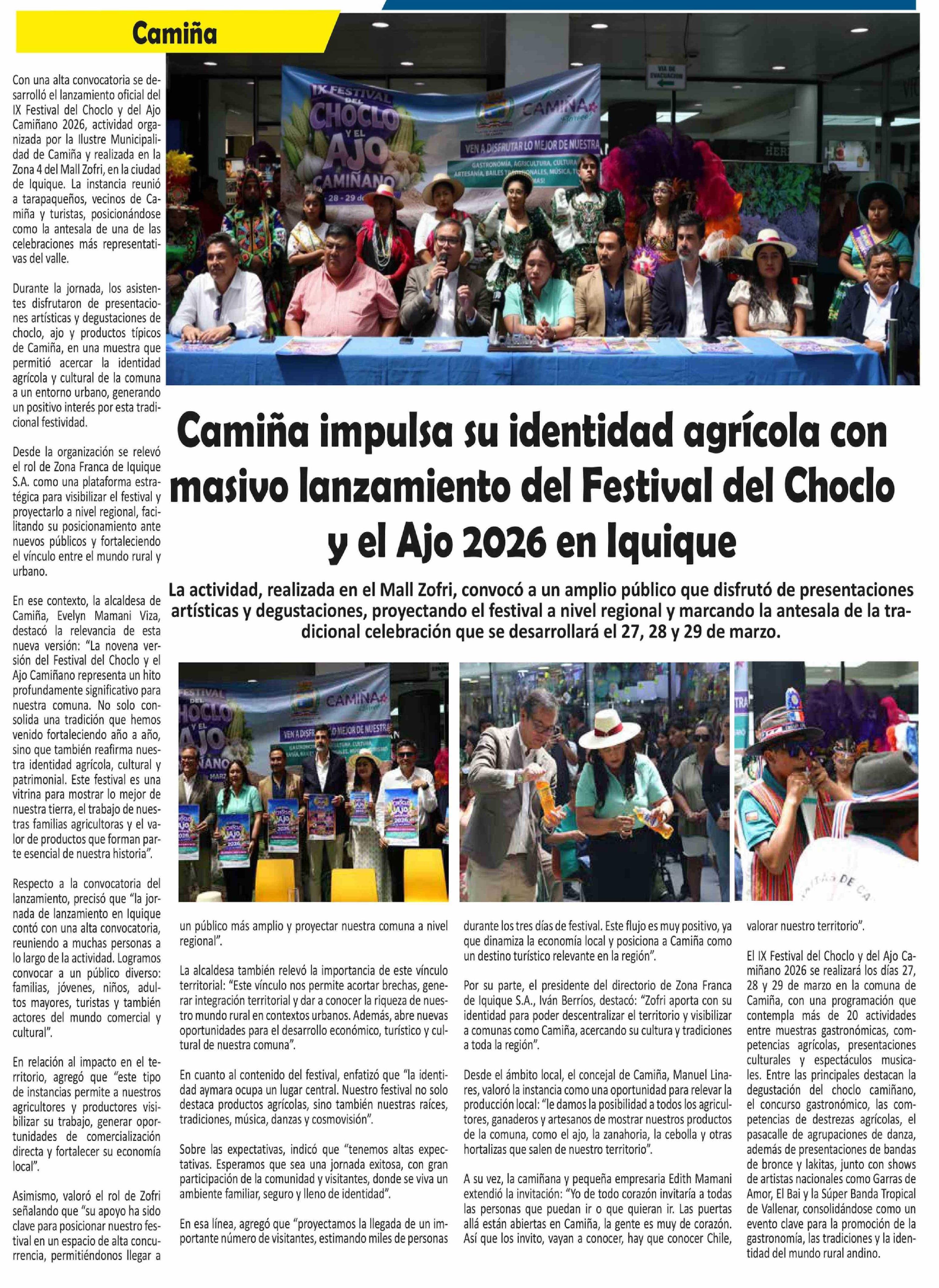 Título: Camiña impulsa su identidad agrícola con masivo lanzamiento del Festival del Choclo y el Ajo 2026 en Iquique