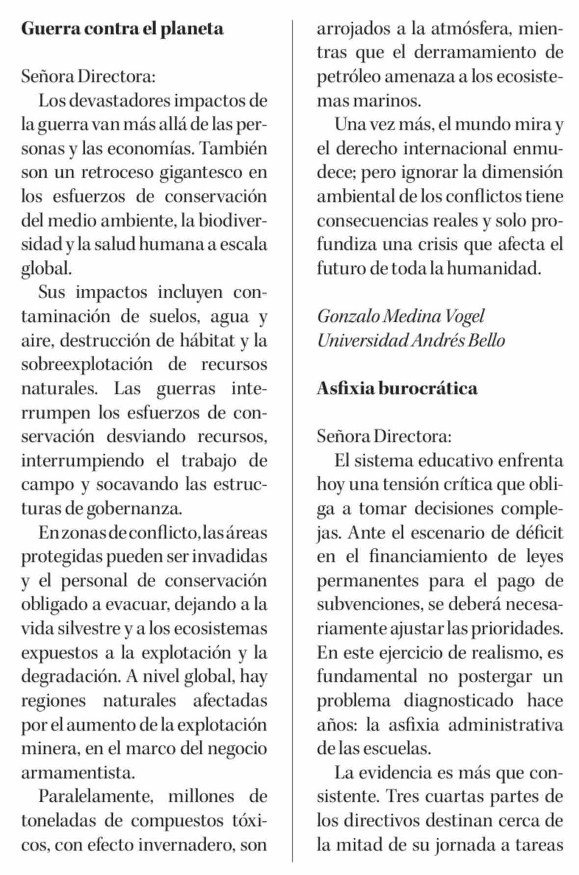Cartas: Guerra contra el planeta 01-04-2026 Diario Concepción |