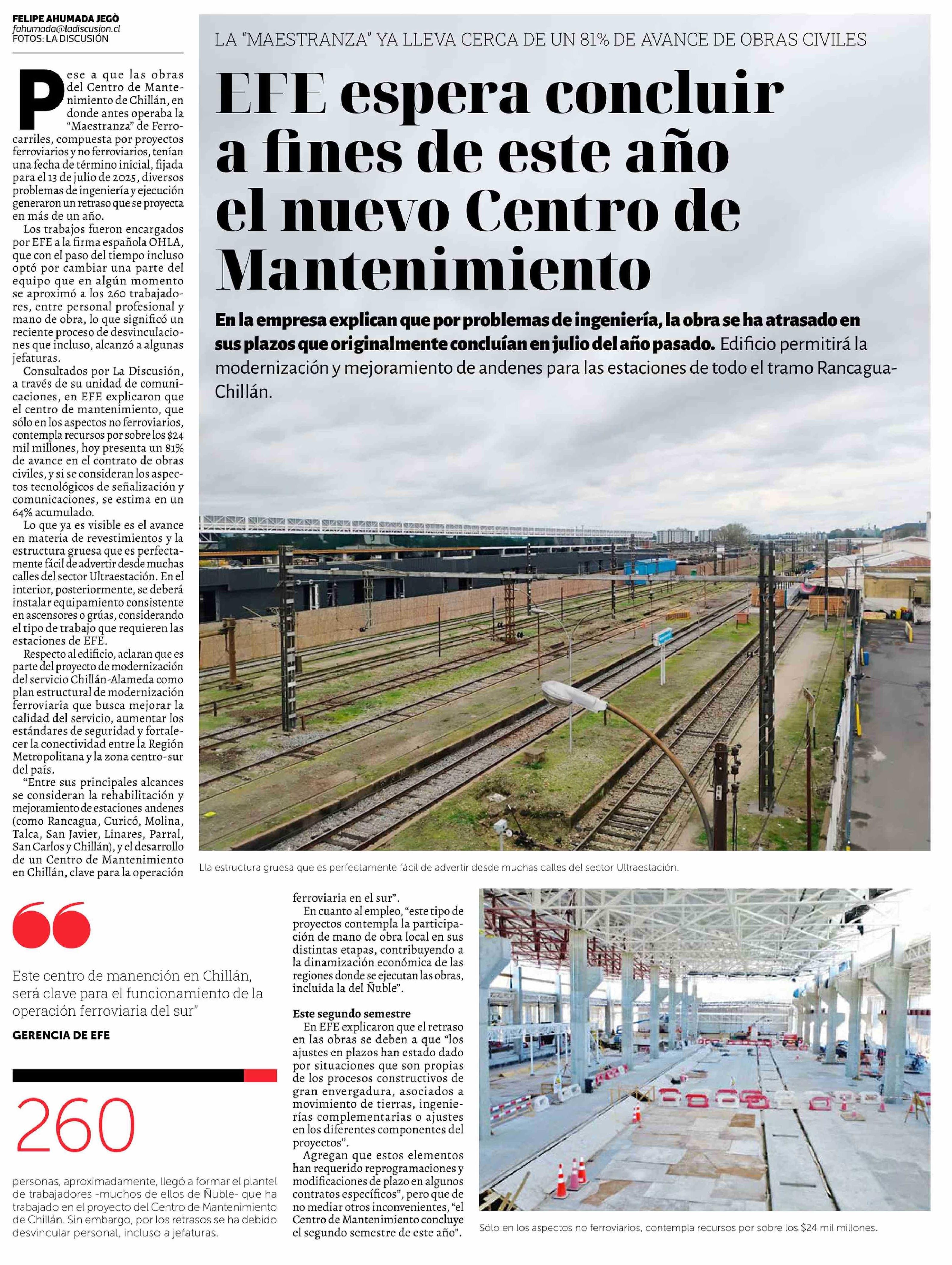 EFE espera concluir a fines de este año el nuevo Centro de Mantenimiento 20-04-2026 La Discusión |