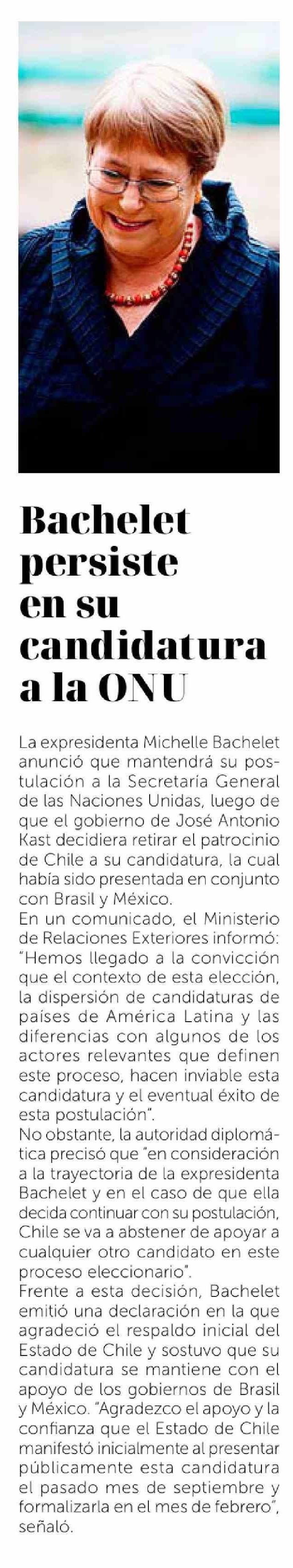 | Título: | Bachelet persiste en su candidatura a la ONU |
