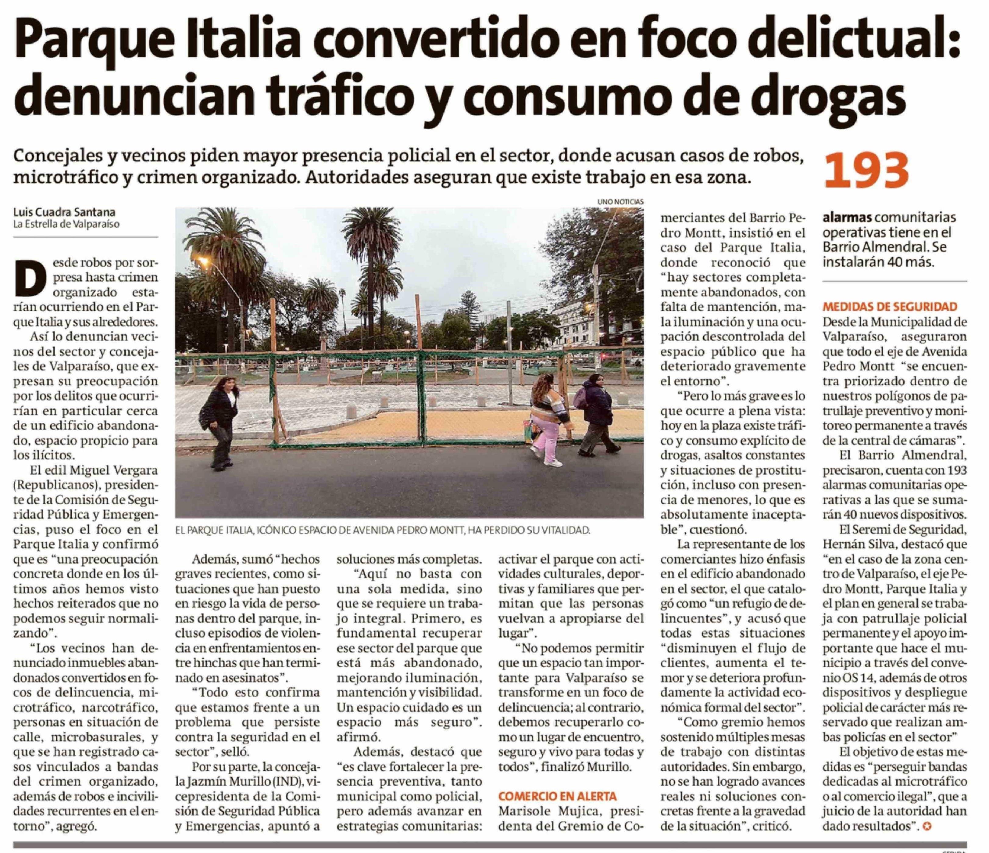 Parque Italia convertido en foco delictual: denuncian tráfico y consumo de drogas 14-04-2026 La Estrella de Valparaíso |