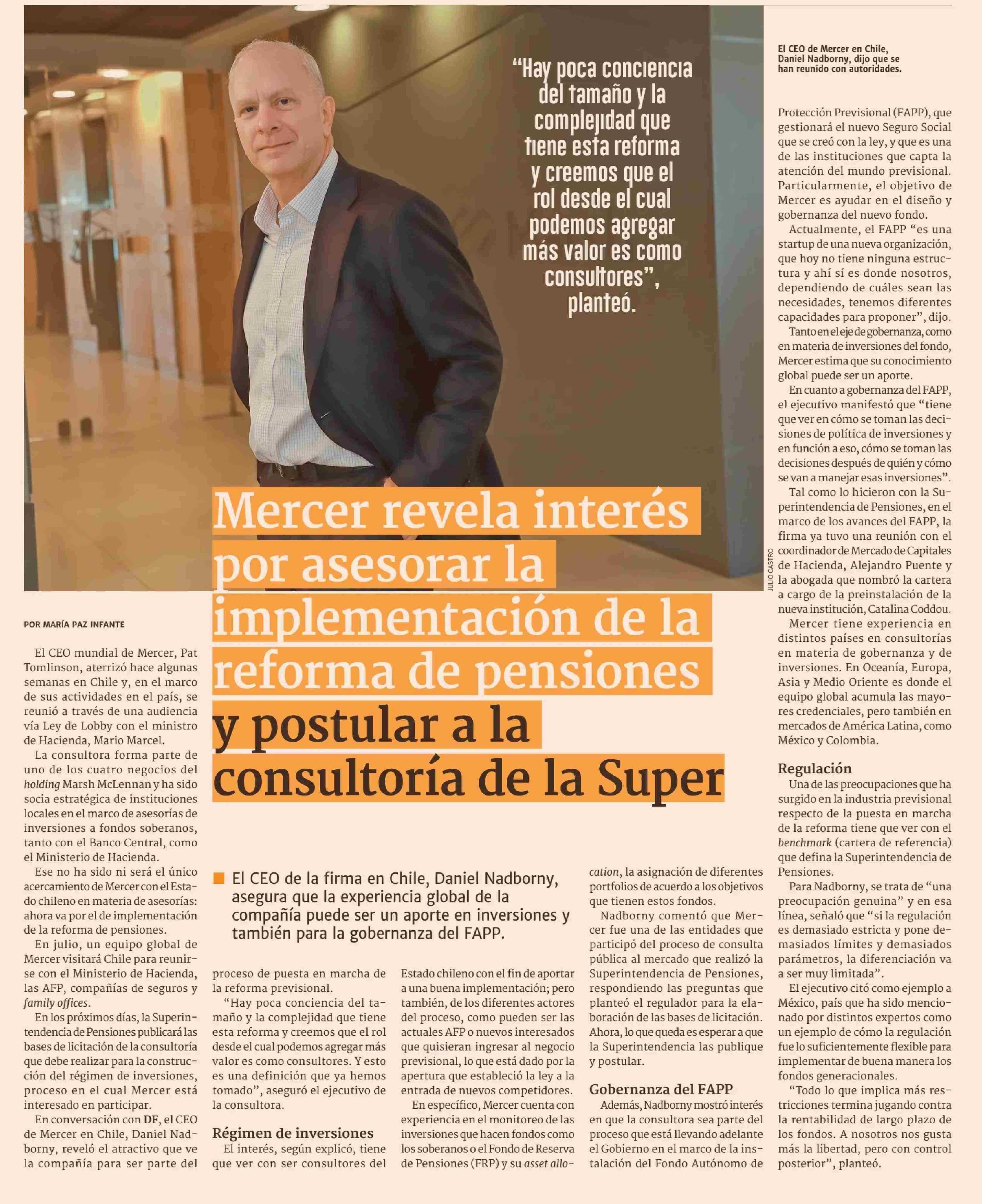 Mercer revela interés por asesorar la implementacion de la reforma de pensiones y postular a la consultoría de la Super 05-06-2025 Diario Financiero |