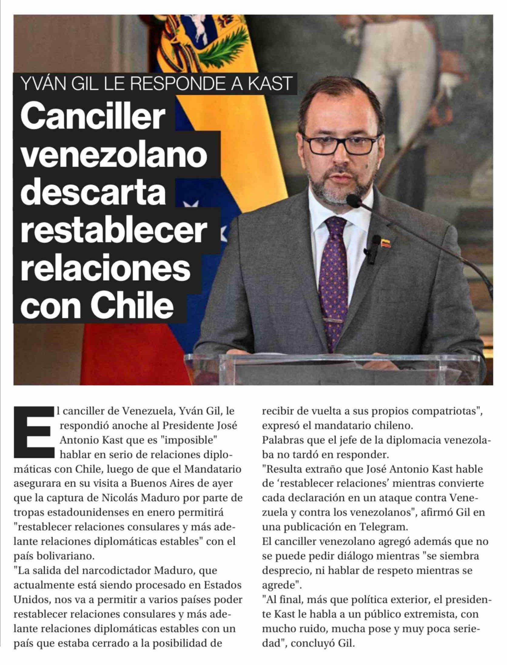 Título: Canciller venezolano descarta restablecer relaciones con Chile