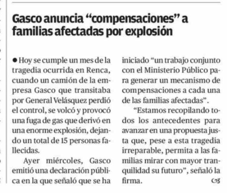 | Título: | Gasco anuncia "compensaciones" a familias afectadas por explosión |