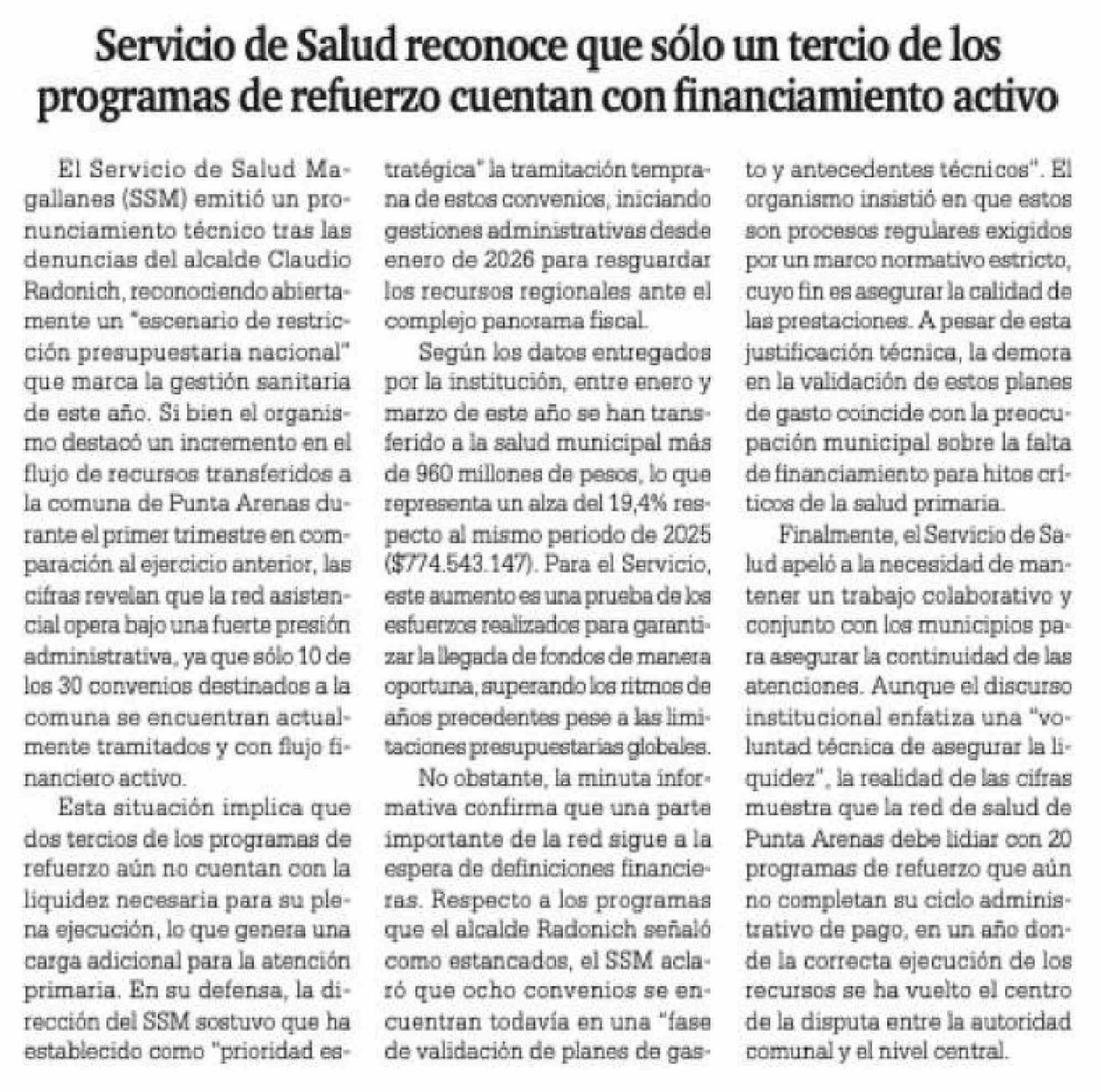 Servicio de Salud reconoce que sólo un tercio de los programas de refuerzo cuentan con financiamiento activo 01-04-2026 La Prensa Austral |