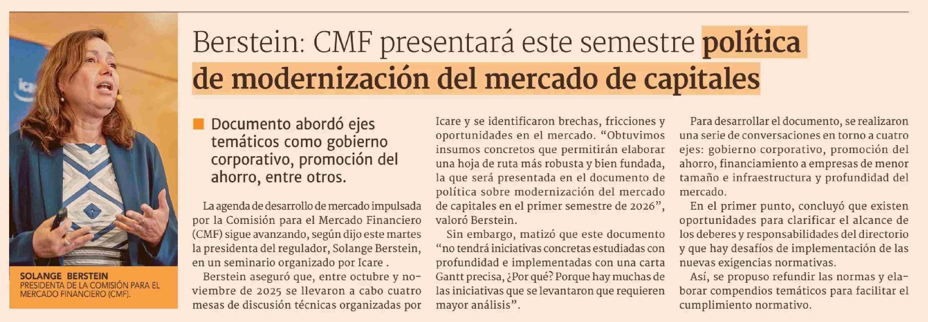 Berstein: CMF presentará este semestre política de modernización del mercado de capitales 14-01-2026 Diario Financiero |