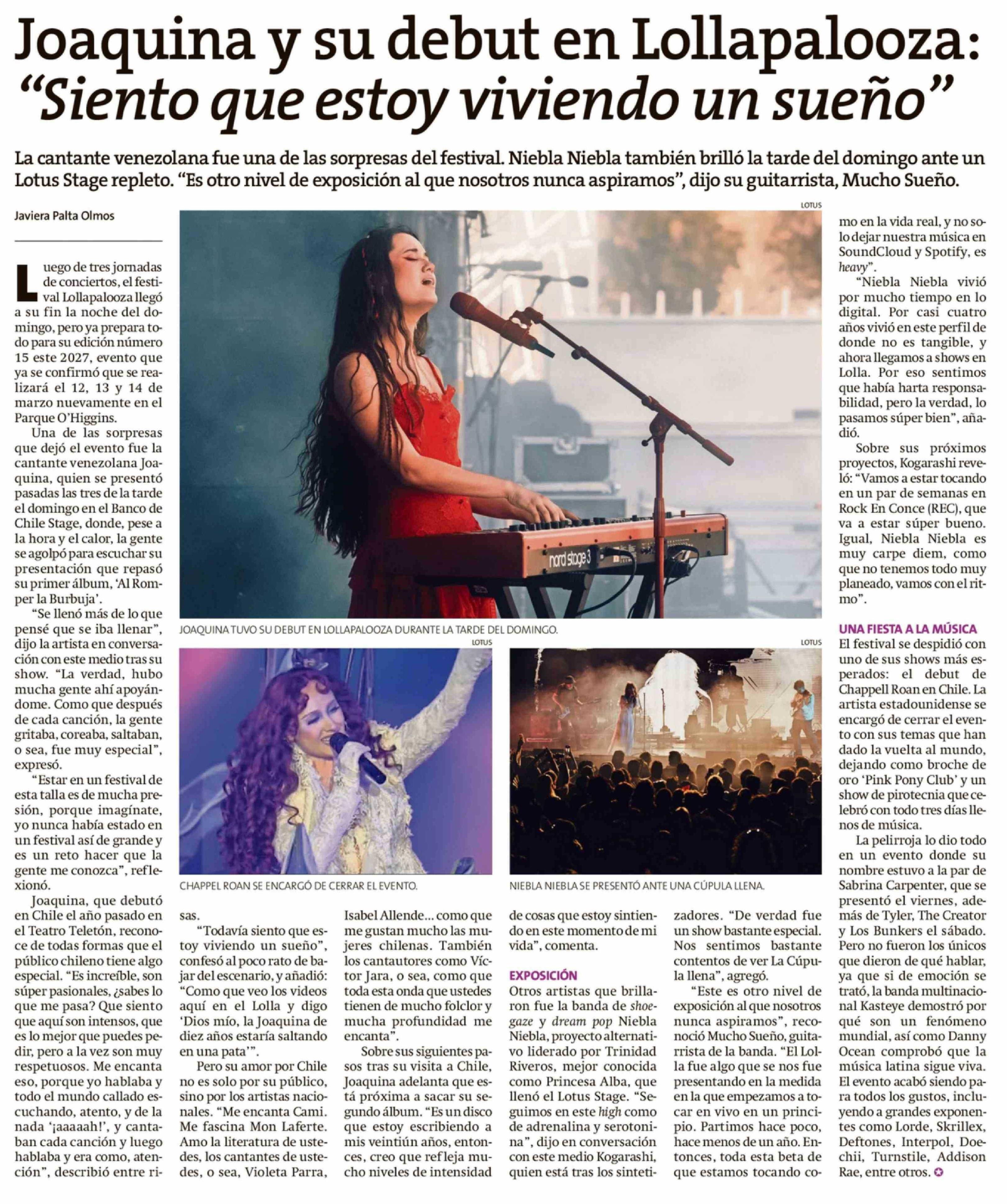 Joaquina y su debut en Lollapalooza: "Siento que estoy viviendo un sueño" 18-03-2026 La Estrella de Chiloé |