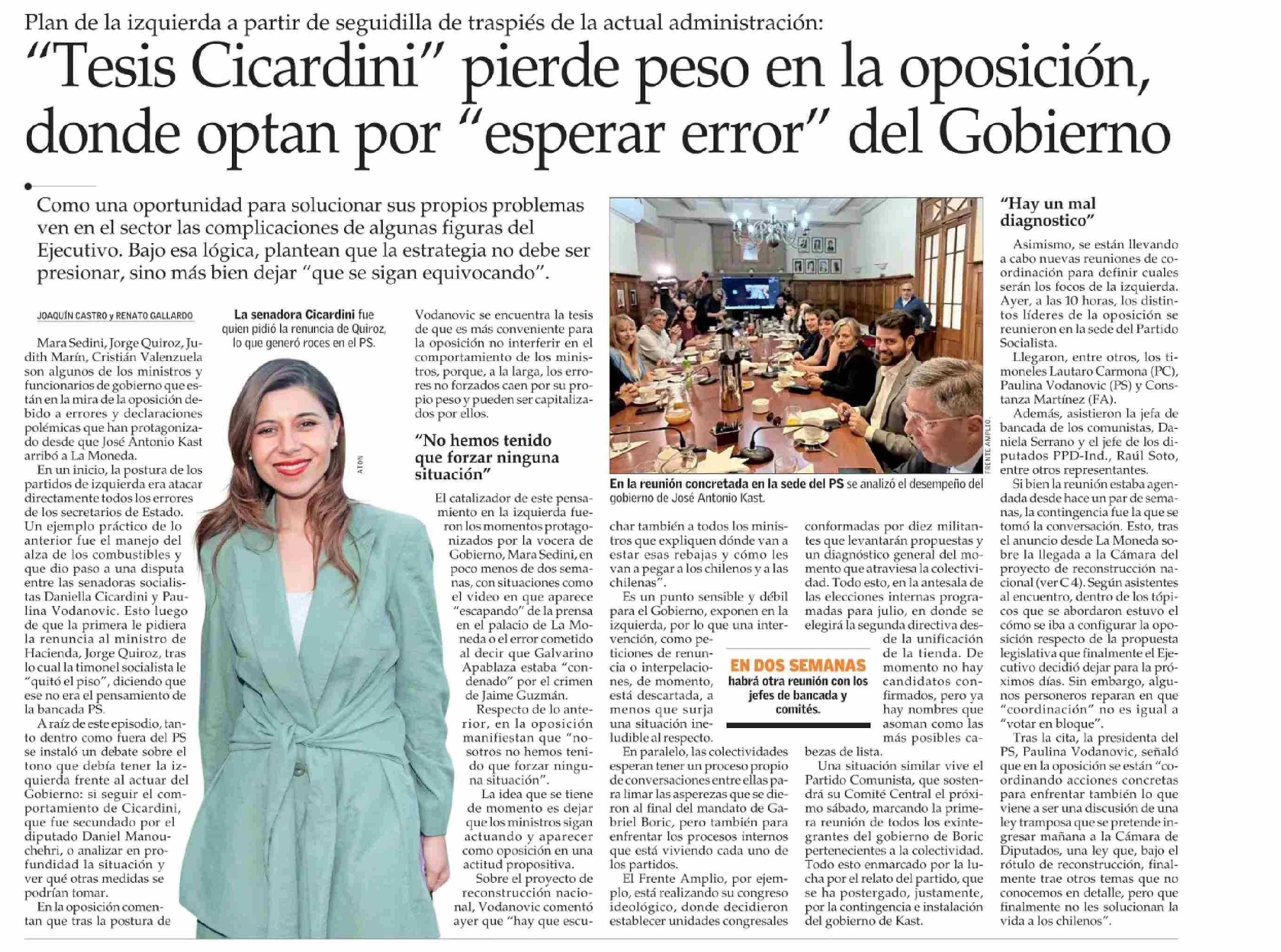 "Tesis Cicardini" pierde peso en la oposición, donde optan por "esperar error" del Gobierno 07-04-2026 El Mercurio |