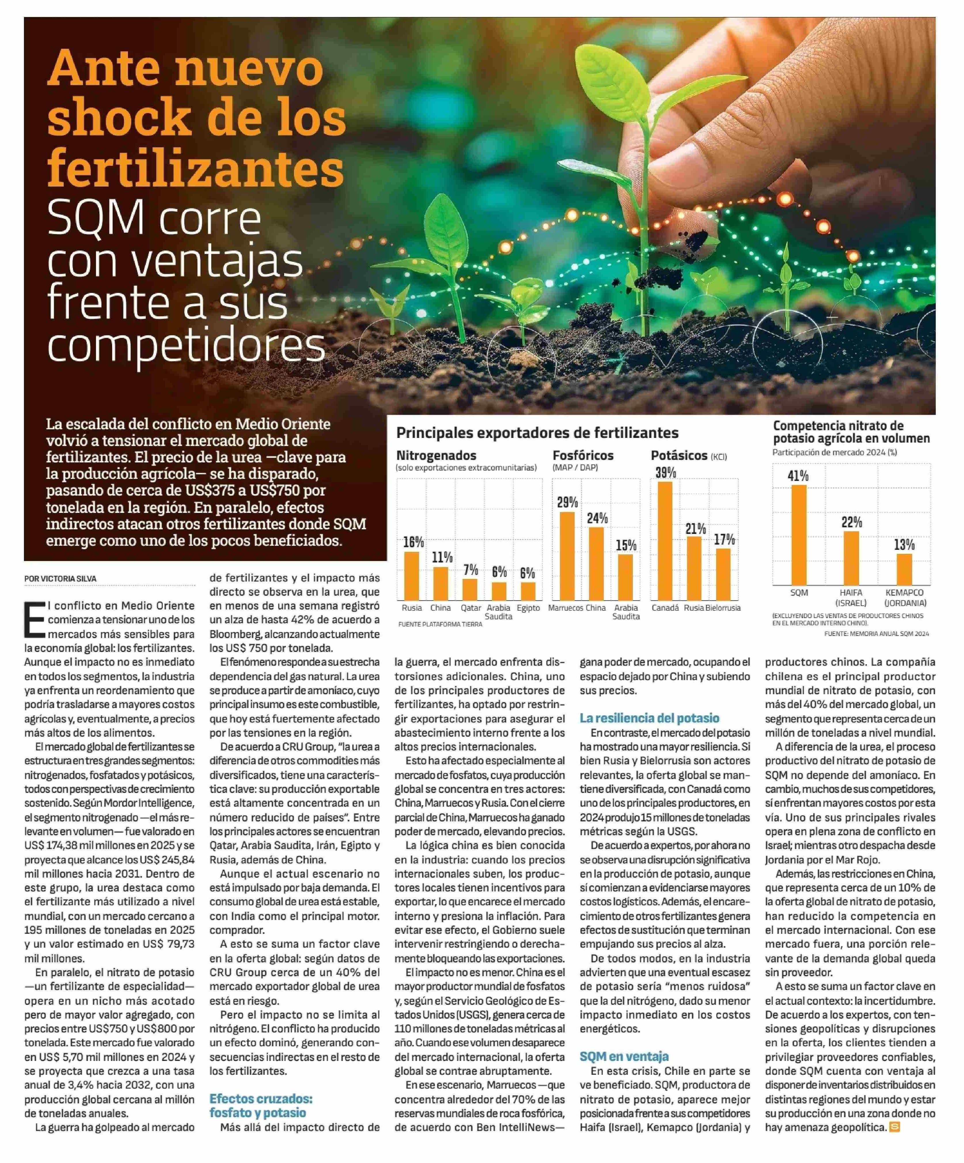 Ante nuevo shock de los fertilizantes SQM corre con ventajas frente a sus competidores. 04-04-2026 Diario Financiero |