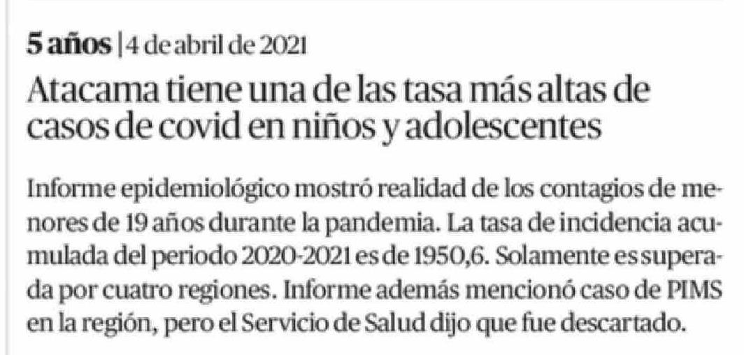 Título: Atacama tiene una de las tasa más altas de casos de covid en niños y adolescentes Informe epidemiológico mostró realidad de los contagios de menores de 19 años durante la pandemia. La tasa de incidencia acumulada del periodo 2020-2021 es de 1950,6. Solamente es superada por cuatro regiones. Informe