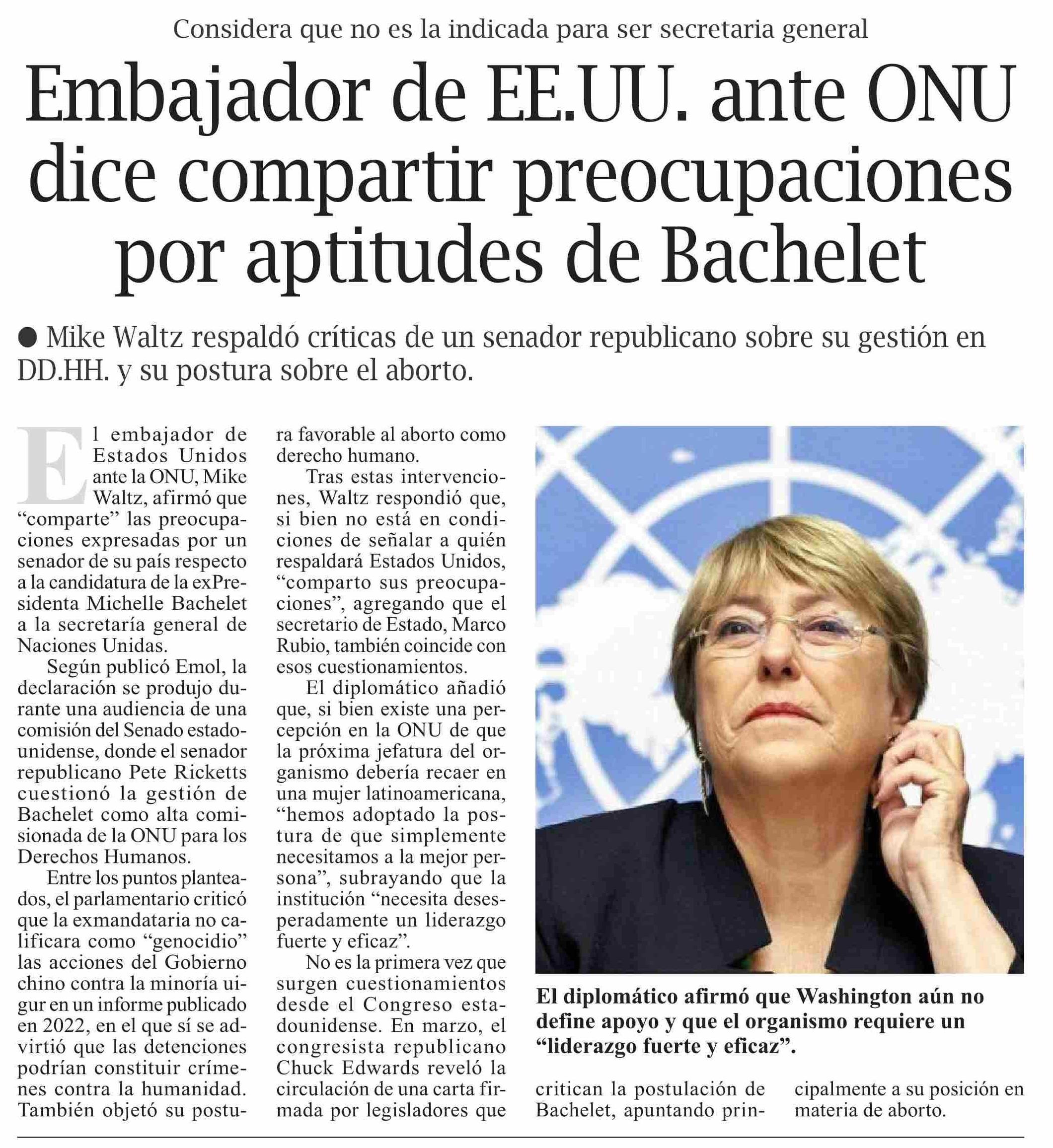 Título: Embajador de EE.UU. ante ONU dice compartir preocupaciones por aptitudes de Bachelet