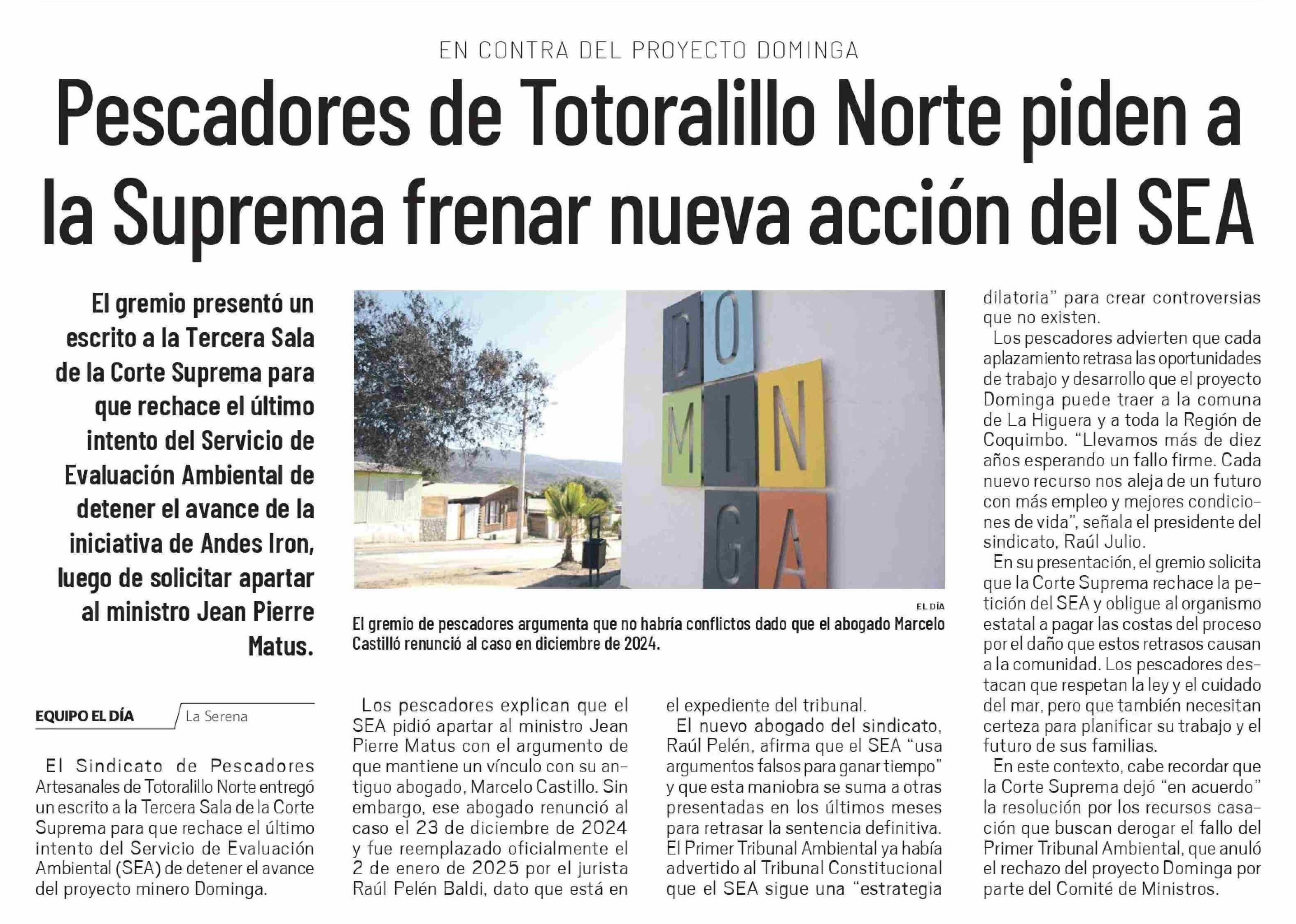 Pescadores de Totoralillo Norte piden a la Suprema frenar nueva acción del SEA 24-05-2025 El Día |