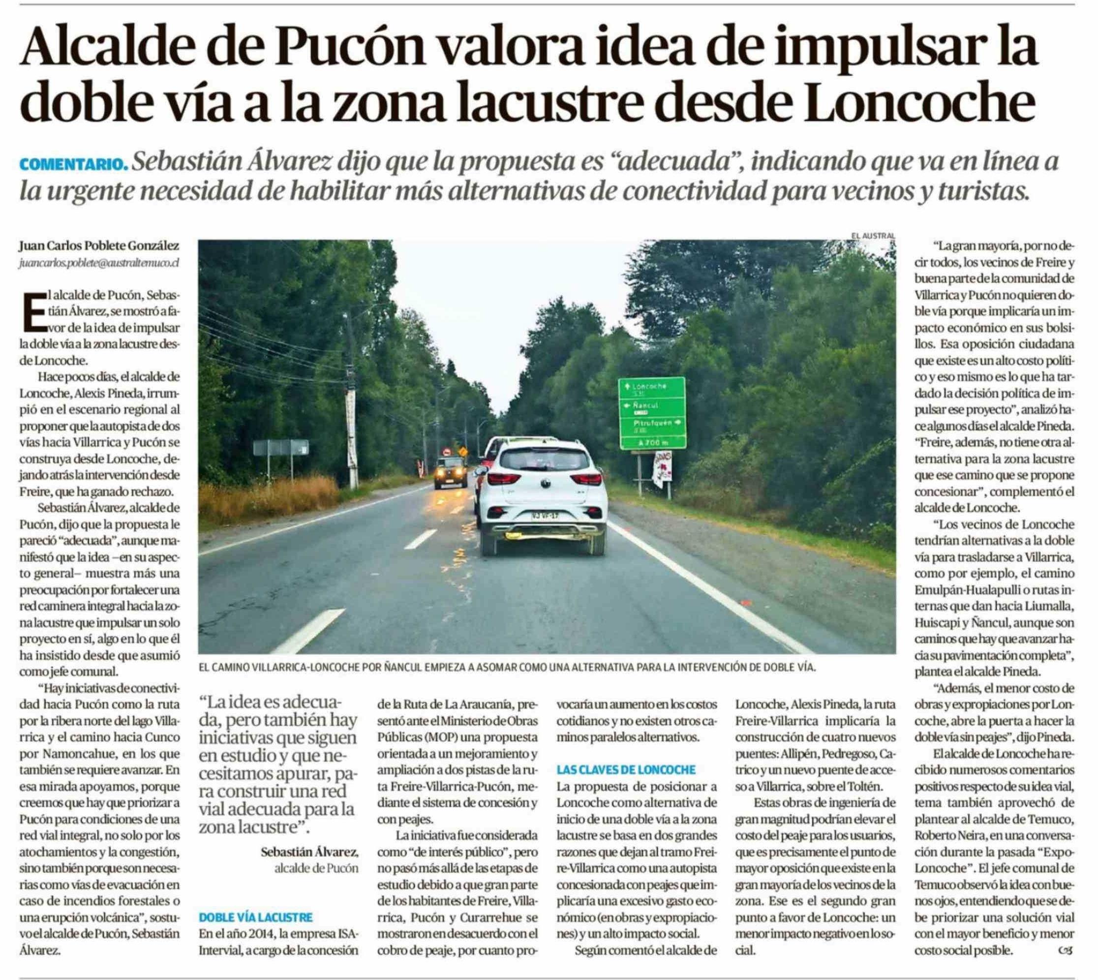 Alcalde de Pucón valora idea de impulsar la doble vía a la zona lacustre desde Loncoche 26-02-2026 El Austral de la Araucanía |
