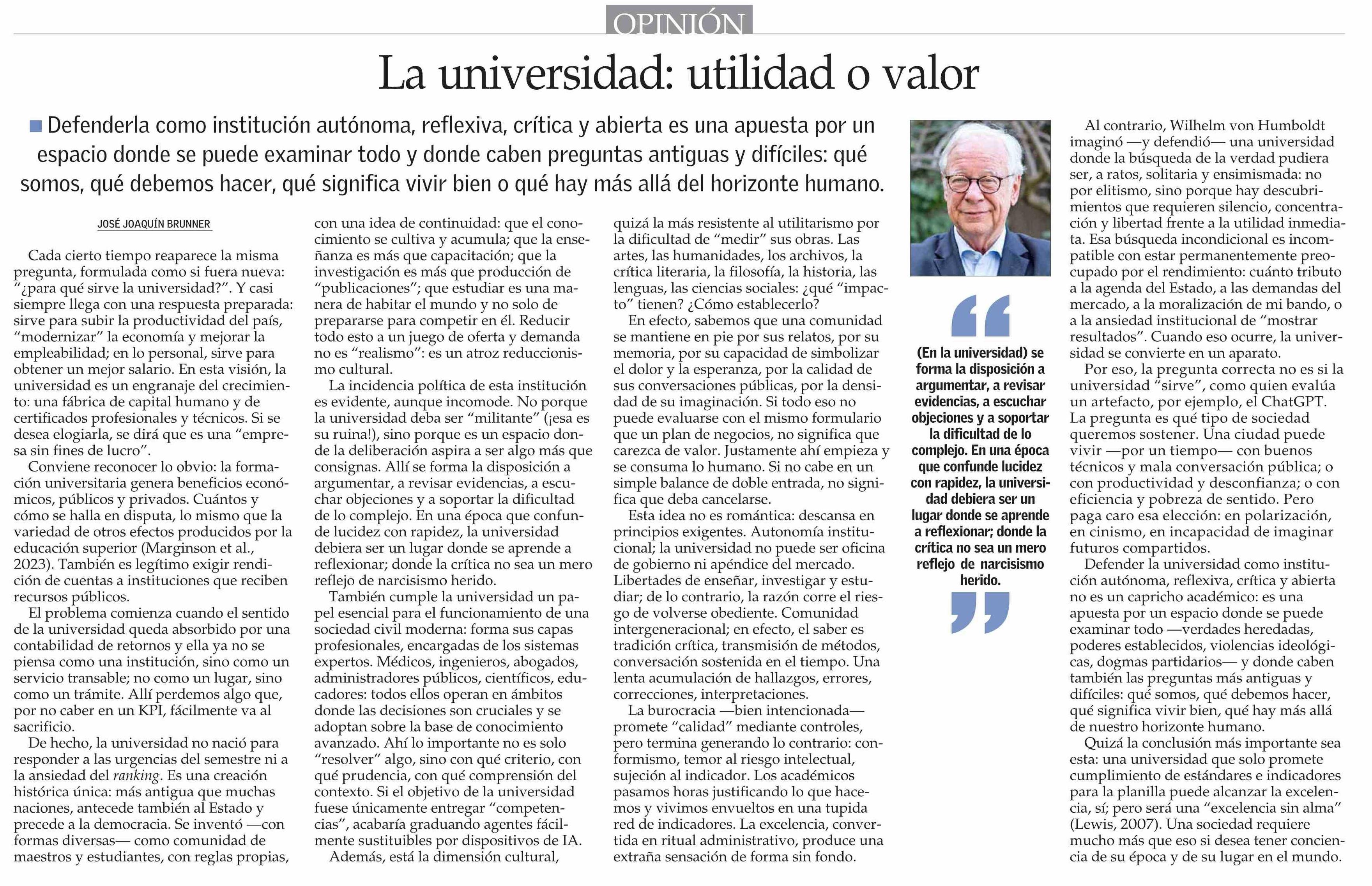 Columnas de Opinión: La universidad: utilidad o valor 11-01-2026 El Mercurio |