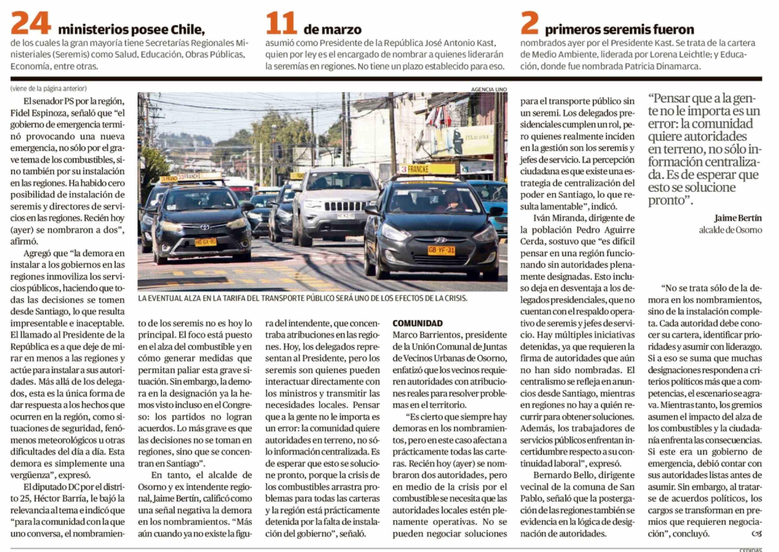 Acusan una excesiva demora en instalación de gobierno en medio de la crisis por el combustible 26-03-2026 El Austral de Osorno |